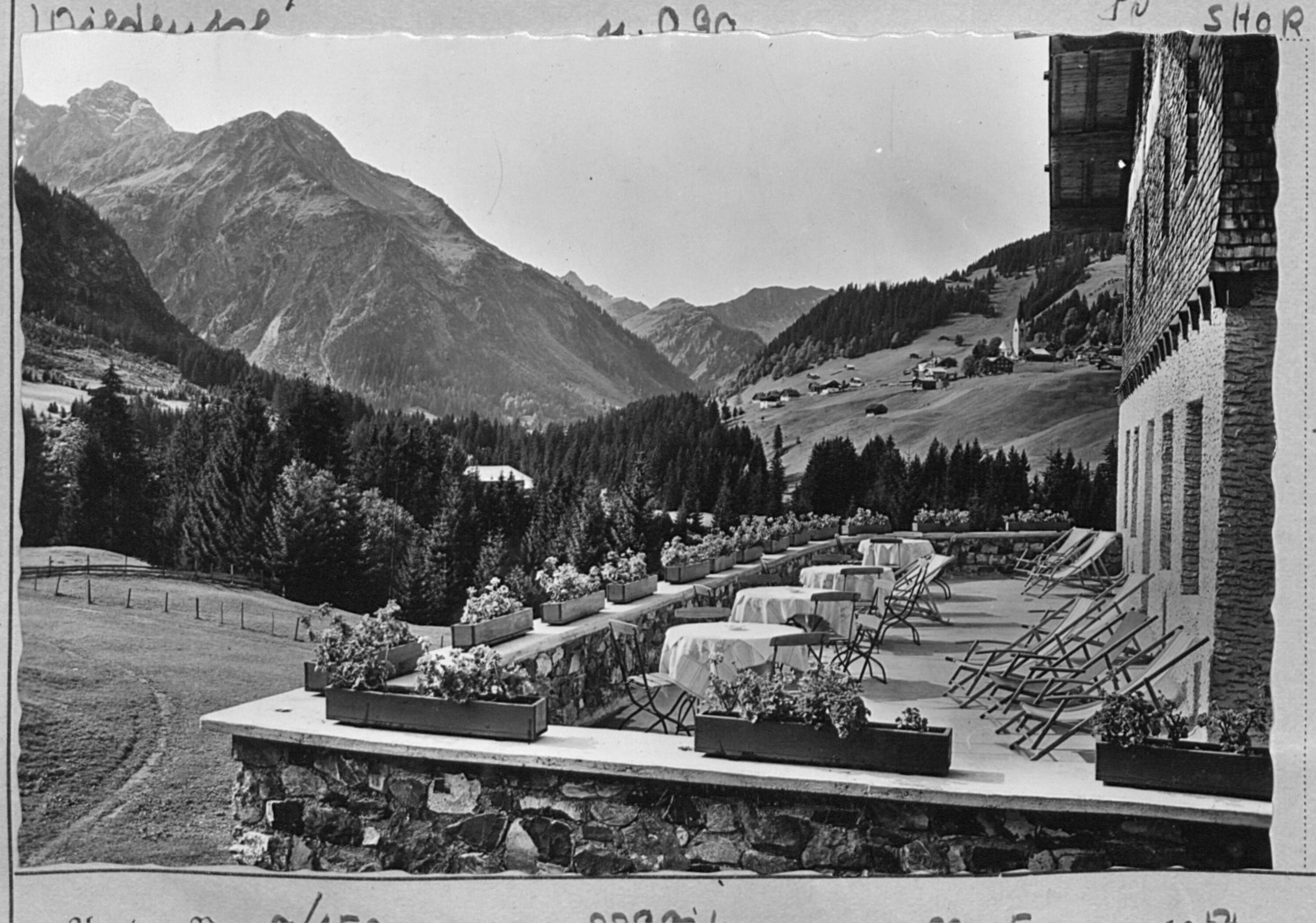 [Blick von der Terrasse des Alpengasthofes Wildental in Höfle gegen Mittelberg, Widderstein und Üntschengrat / Kleinwalsertal]