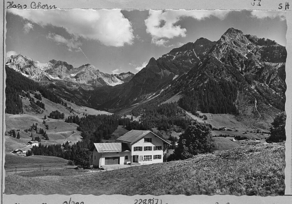 [Haus Ahorn bei Mittelberg gegen Schafalpenköpfe, Kemptner Kopf, Elferkopf und Zwölferkopf / Kleinwalsertal]
