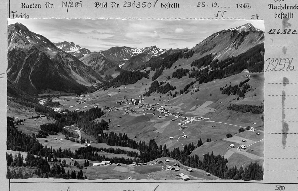 [Blick auf Mittelberg gegen Bärenkopf, Heiterberg, Üntschengrat, Güntlespitze, Üntschenspitze und Walmedinger Horn / Kleinwalsertal]