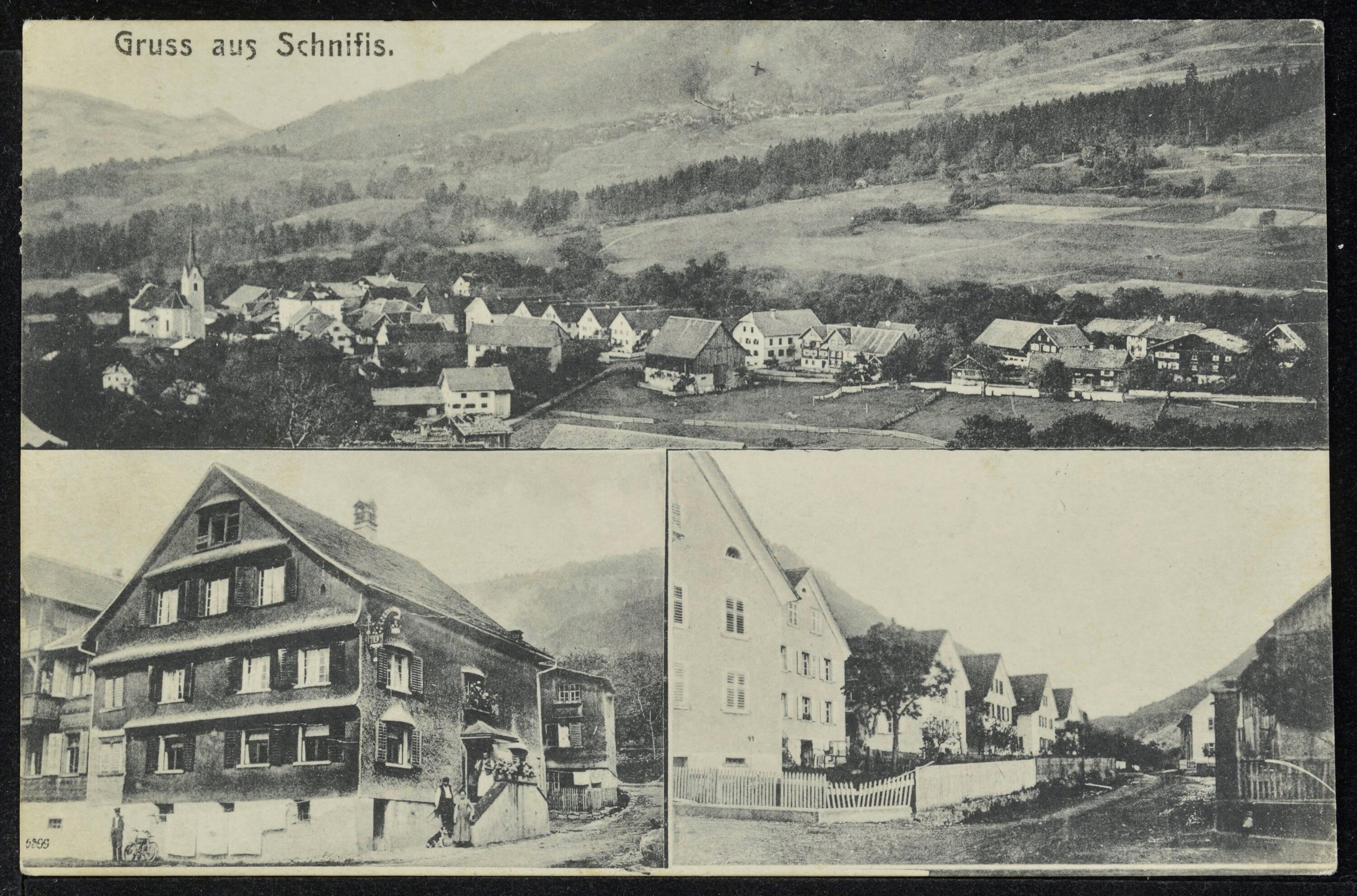 Gruss aus Schnifis : Kirche mit Pfarrhaus : Das Jnnere des Dorfes : [Correspondenz-Karte An ... in ...]