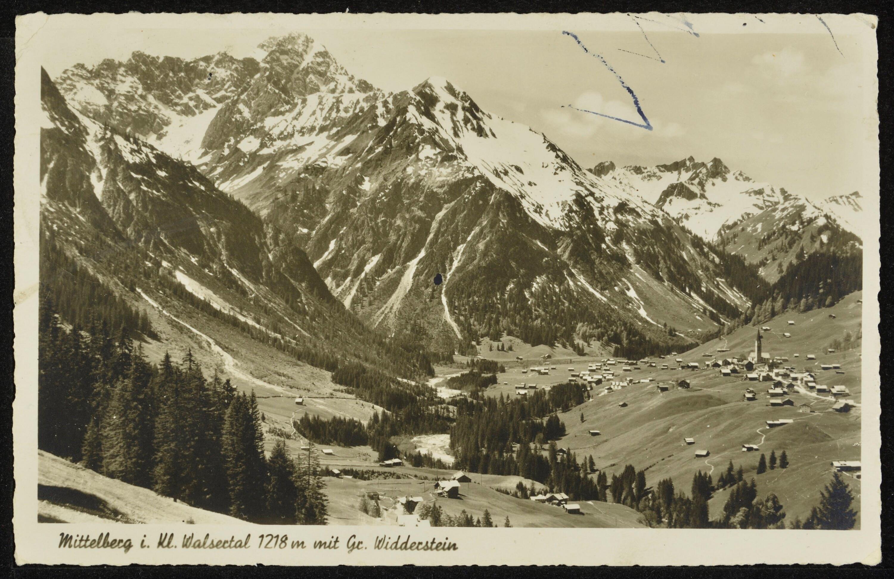 Blick auf Mittelberg i. Kl. Walsertal 1218 m mit gr. Widderstein u. Bärenkopf