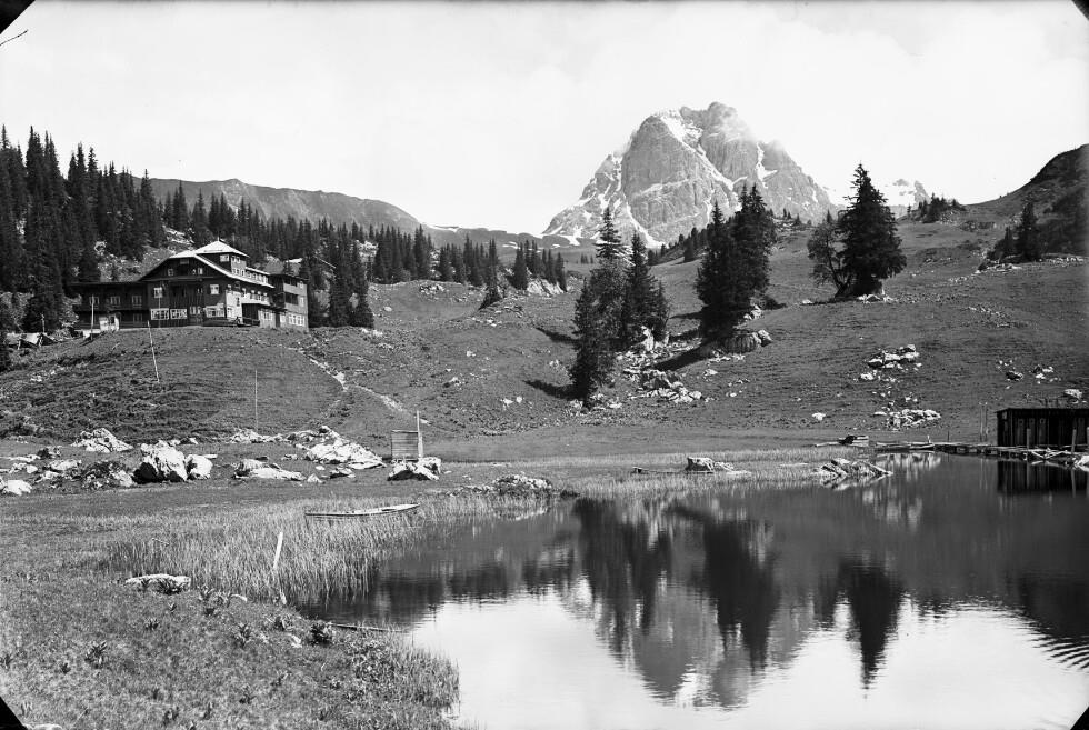 [Schröcken] : [Körbersee mit Hotel 1700 m gegen Braunarlspitze 2651 m ...]