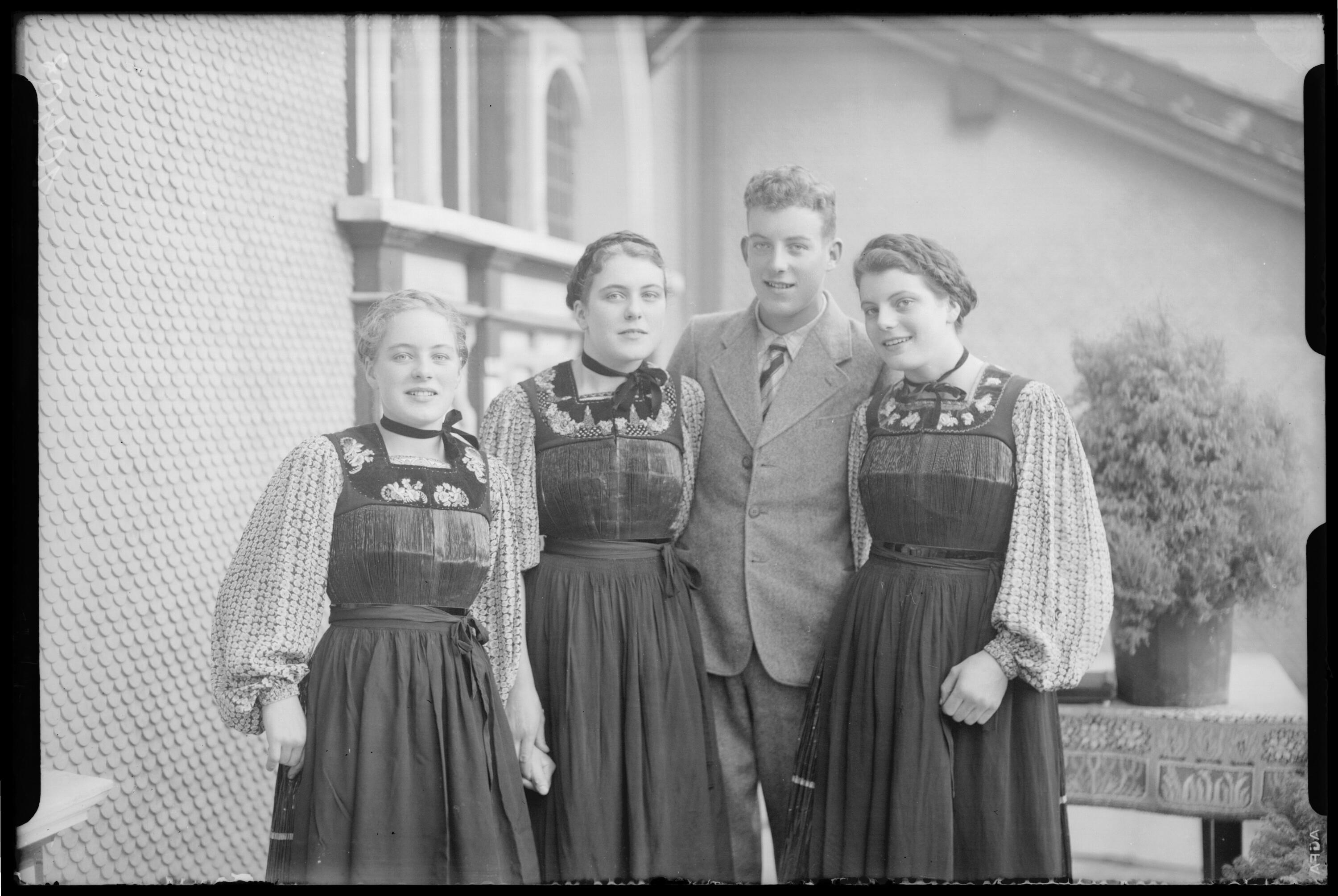 • v.l.n.r.: Maria Berlinger, verehel. Fritz (geb. 31.03.1920 Au [Taufbuch Au], gest. 13.12.1996 [Vorarlberger Nachrichten Todesanzeige 14.12.1996]); Katharina Berlinger, verehel. Lingg, Kronenwirtin (geb. 04.06.1922, gest. 20.07. 2016 [Vorarlberger Nachrichten Todesanzeige online]); Albert Berlinger (geb. 22.03.1921 Au, gef. 25.07.1941 Ukraine [Sterbebildsammlung Gottfried Winkel]); Hedwig Berlinger, verehel. Rützler (geb. 27.08.1923; gest. 18.05.2007 [Vorarlberger Nachrichten Todesanzeige online])