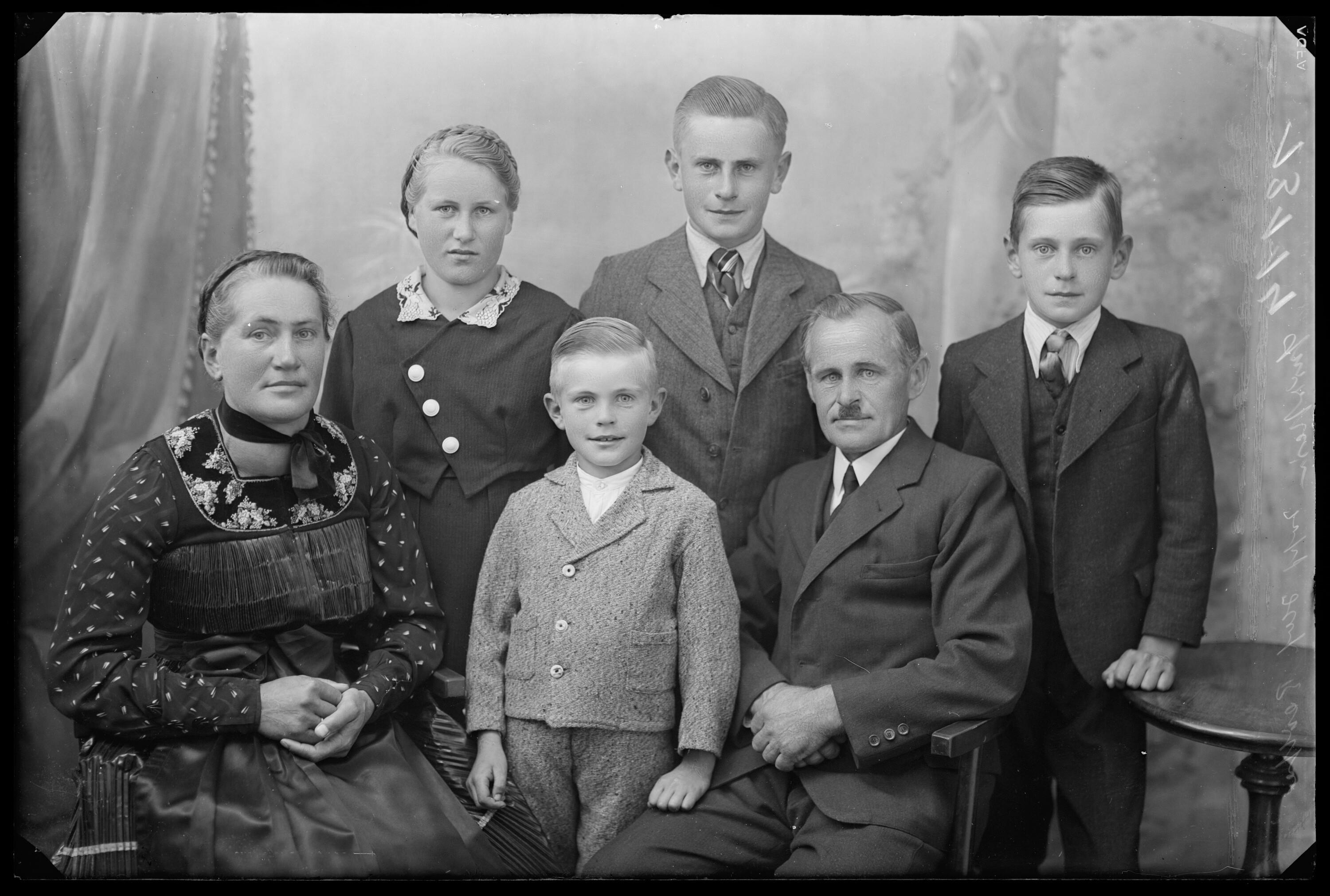 • 1. Reihe v.l.n.r.: Emilie Feurstein, geb. Mennel (geb. 20.07.1896 Hittisau [Taufbuch Hittisau], gest. 25.02.1963 Bezau [Taufbuch Hittisau, Vorarlberger Nachrichten Todesanzeige 26.02.1963]); Friedrich (gest. Gottfried Winkel); Josef Feurstein (geb. 05.09.1896 Reuthe [Taufbuch Reuthe], gest. 08.01.1989 Reuthe [Sterbebildsammlung Gottfried Winkel]); stehend v.l.: Rosa, Jakob und Hubert (alle gest. Gottfried Winkel)