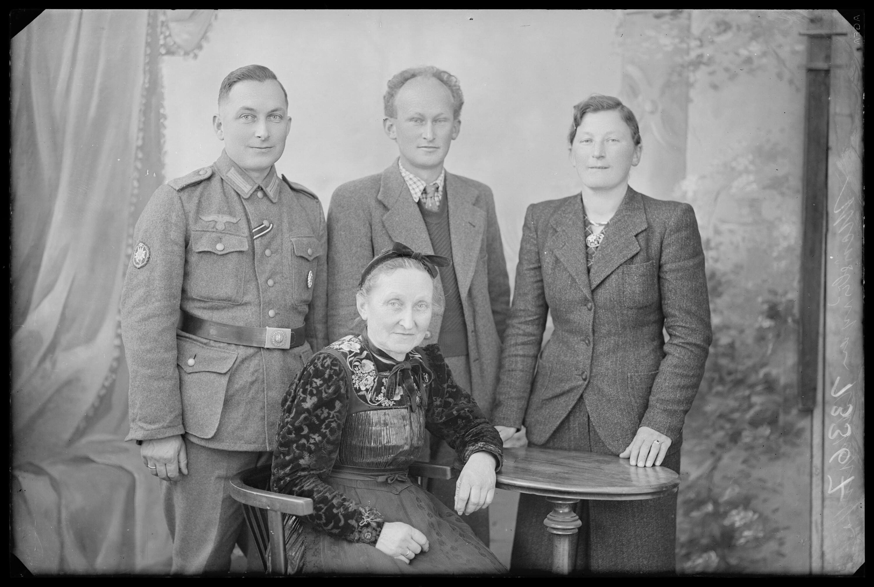 • sitzend: Mutter Maria Anna Meusburger, geb. Meusburger (geb. 15.04.1884 Bizau, gest. 02.12.1962 Reuthe [Sterbebildsammlung Gottfried Winkel]); Kinder v.l.n.r.: Alfons Meusburger (geb. 06.11.1911 Reuthe [Taufbuch Reuthe], gest. 02.04.1995 [Sterbebildsammlung Gottfried Winkel]); Josef Meusburger (geb. 31.12.1912 Reuthe [Taufbuch Reuthe], gef. 17.01.1945 [Sterbebildsammlung Gottfried Winkel]); Leokadia Elisabeth Meusburger (geb. 07.04.1915 Reuthe [Taufbuch Reuthe], gest. 21.02.1972 Reuthe [Sterbebildsammlung Gottfried Winkel])