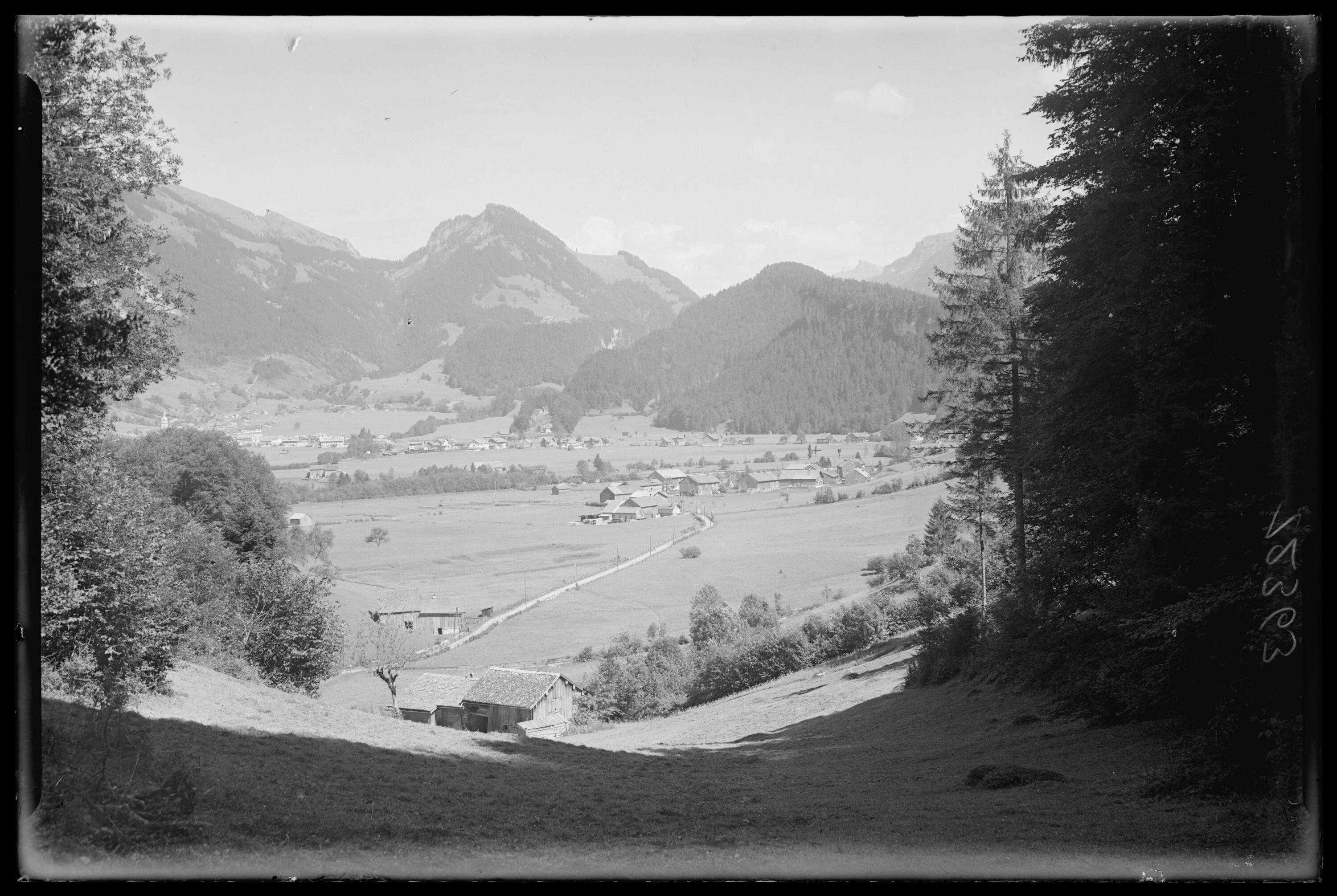 • von Reuthe, Talstein aus Blick auf Reuthe-Baien; im Hintergrund Bezau; links im Hintergrund Winterstaude; rechts im Hintergrund Hoher Ifen;