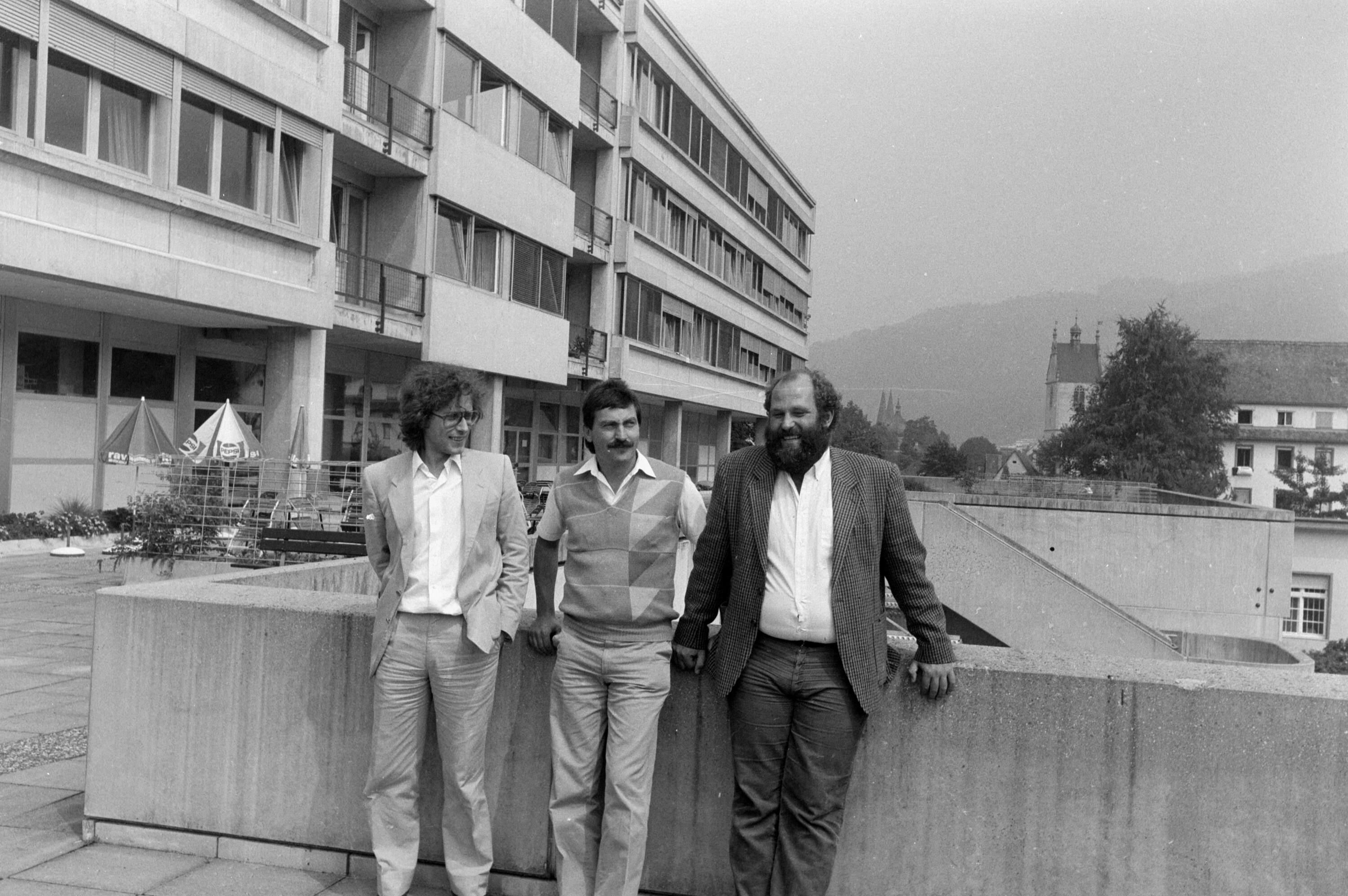 Drei Männer und St. Gallus im Hintergrund