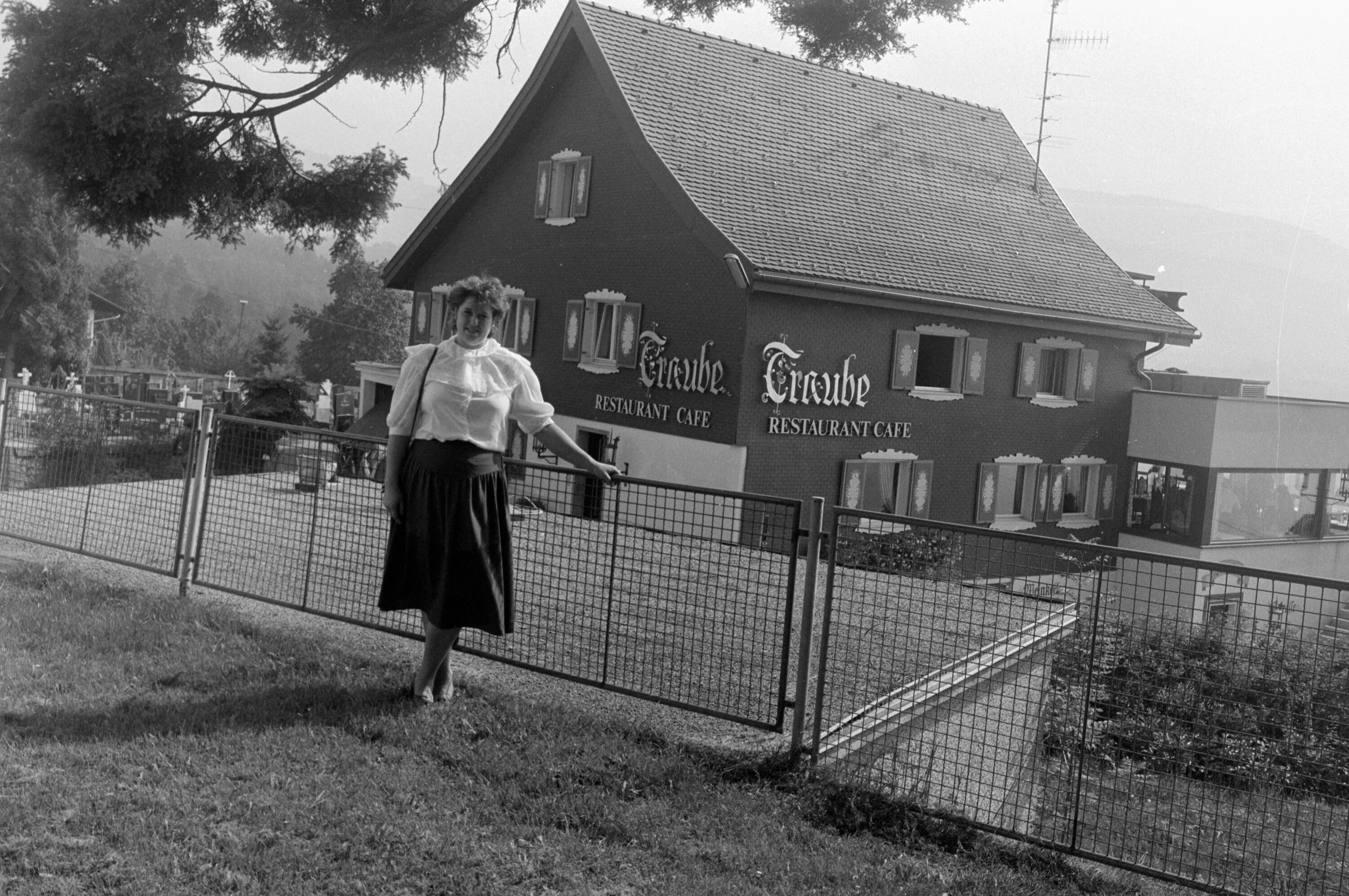 Foto einer Frau vor dem Gasthaus Taube in Bildstein