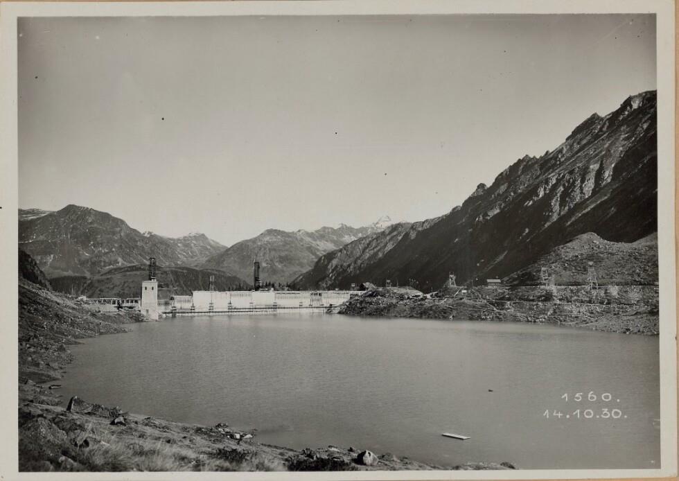 Staumauer Vermunt, vom westlichen Damm des Provisoriums gesehen, Stauh. 1724,23