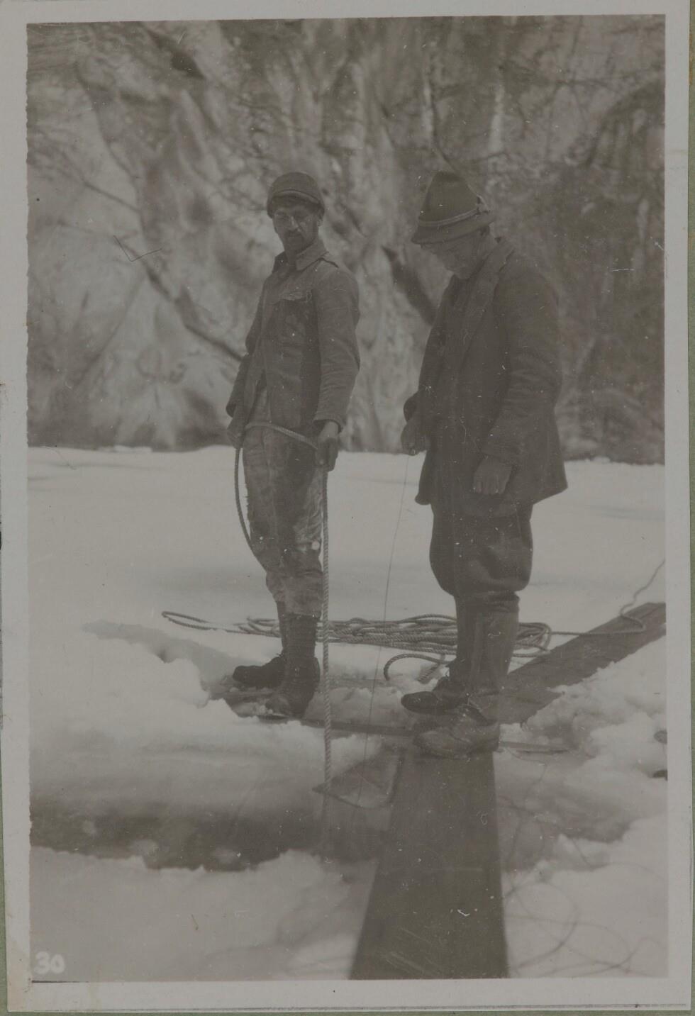 • 2 Arbeiter bei der Entnahme der Seewasserproben, auf Bretter stehend