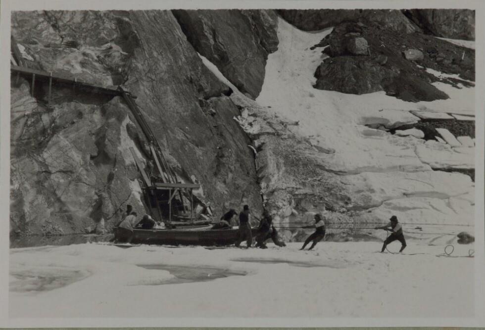 • Neun Arbeiter beim Ziehen des Landbootes auf dem See, Holzbauwerk und Behelfsmittel im Hintergrund