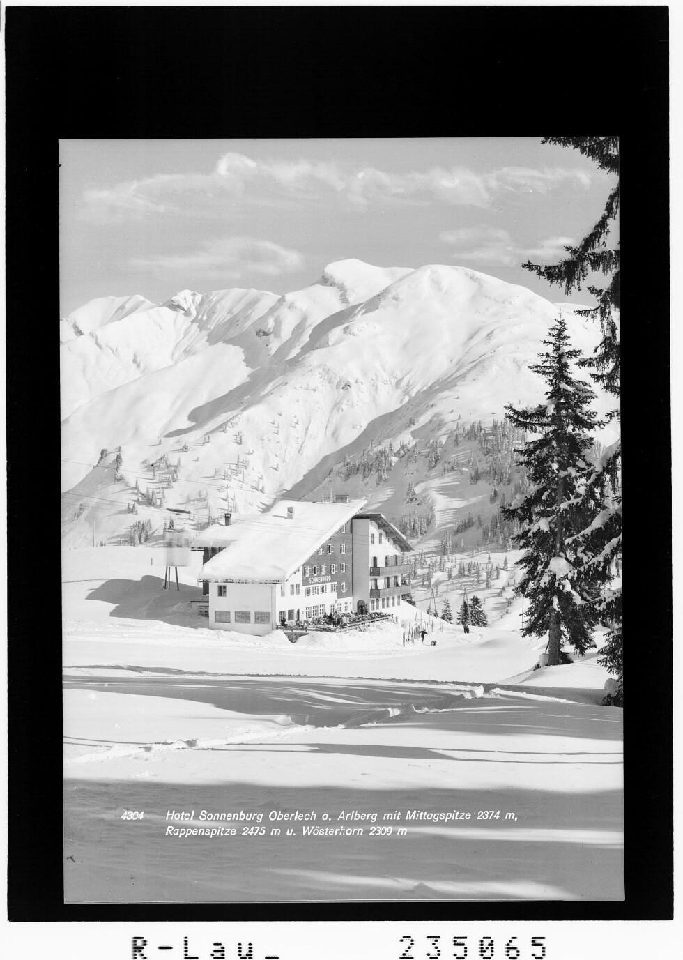 Hotel Sonnenburg in Oberlech am Arlberg mit Mittagspitze 2374 m, Rappenspitze 2475 m und Wösterhorn 2309 m