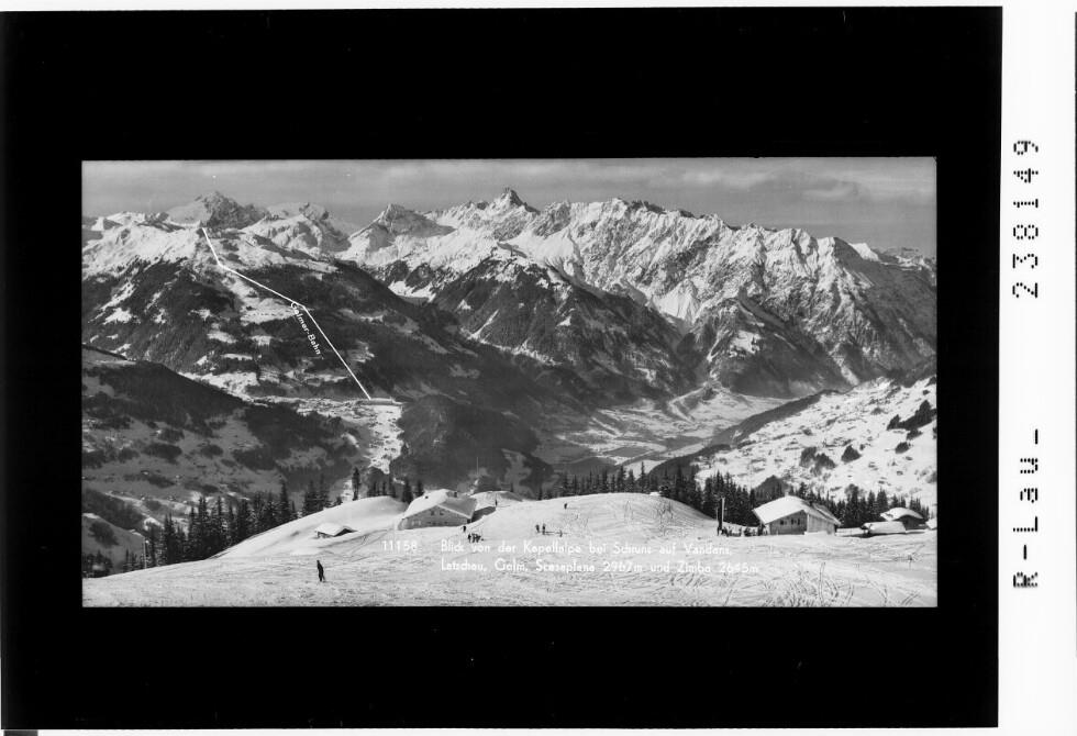 Blick von der Kapellalpe bei Schruns auf Vandans, Latschau, Golm, Scesaplana 2967 m und Zimba 2645 m