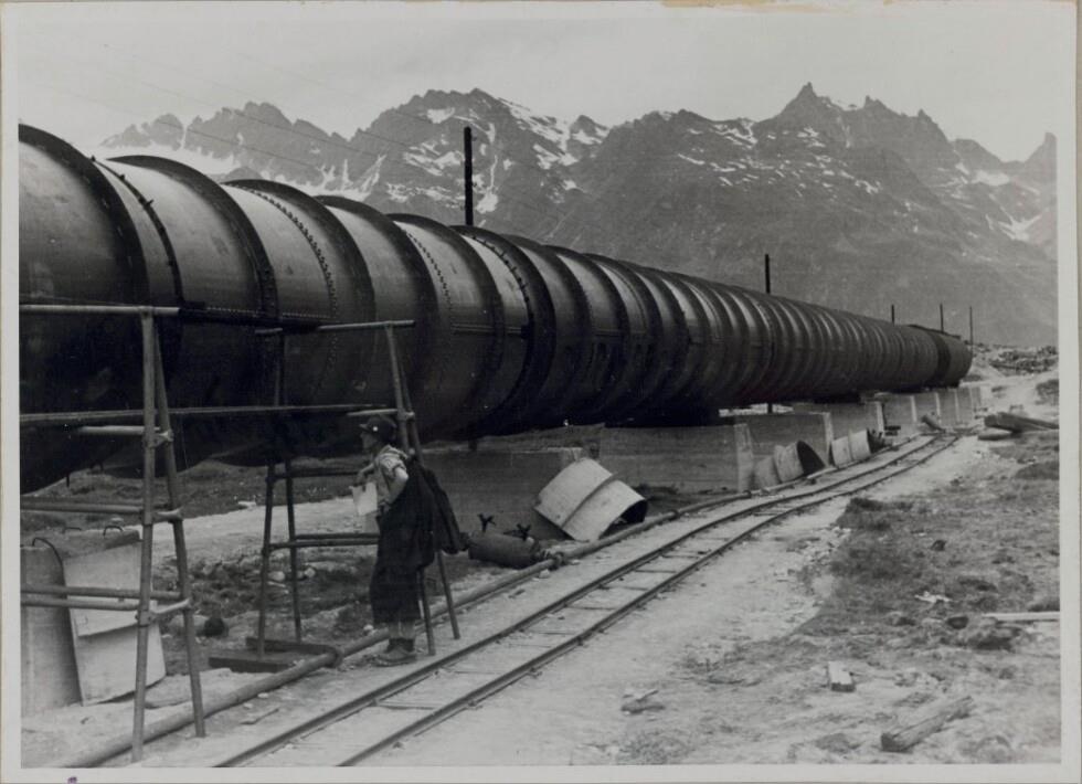 Druckrohrleitung Flachstrecke F.P. 3 und 5, Ansicht v.d. Doppelstopfbühne 4. 5 gegen F.P. 4