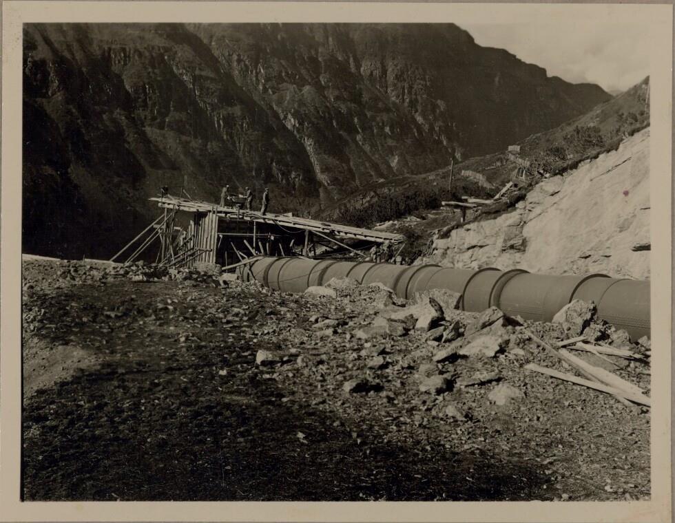 Druckrohrleitung Flachstrecke F.P. 3 und 5, Ansicht v.d. Doppelstopfbühne 4. 5 gegen F.P. 4