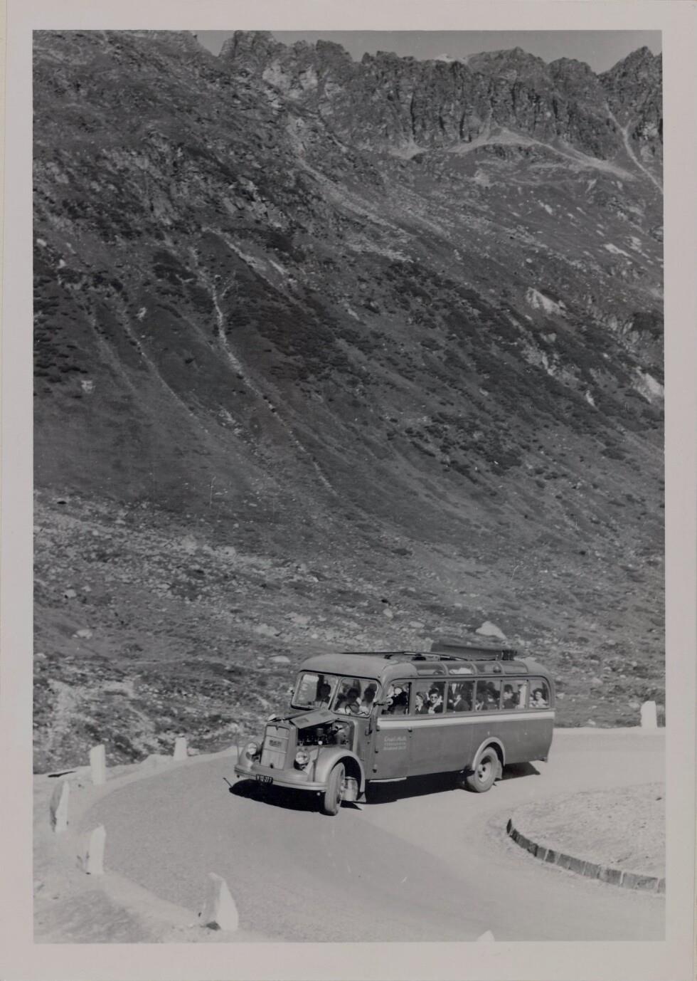 • Silvrettastraße, fahrender Bus der Firma Ernst Melk in einer Kehre