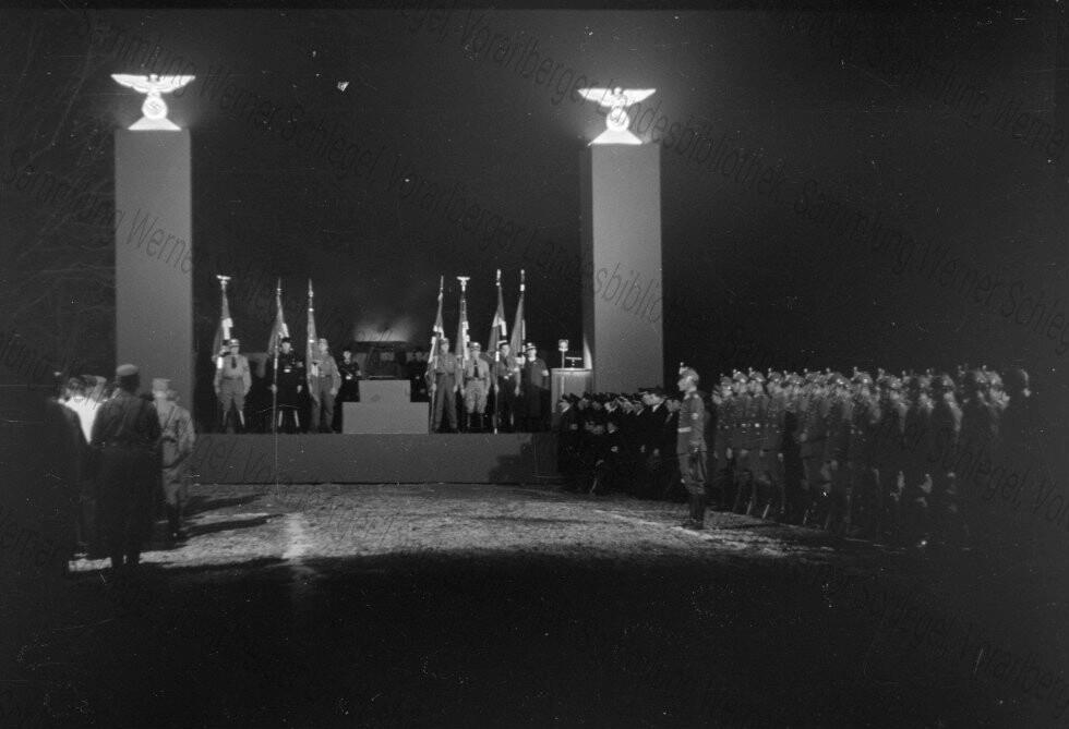 Diese Aufnahmen stammen vom Fotografen Werner Schlegel (1908-1945), der in den Jahren 1938 bis 1940 zahlreiche politische und gesellschaftliche Ereignisse in Vorarlberg fotografisch dokumentiert hat. Aufgrund des sensiblen Inhalts weisen wir ausdrücklich auf unsere Nutzungsbedingungen sowie die Sammlungsbeschreibung hin. Jeglicher Missbrauch der Bilder, insbesondere die Verwendung der Bilder zur Verbreitung nationalsozialistischen Gedankenguts, wird straf- und zivilrechtlich verfolgt.
