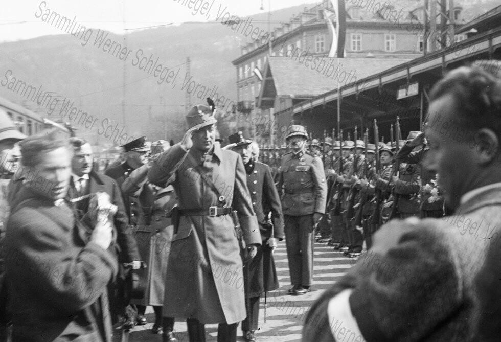 Diese Aufnahmen stammen vom Fotografen Werner Schlegel (1908-1945), der in den Jahren 1938 bis 1940 zahlreiche politische und gesellschaftliche Ereignisse in Vorarlberg fotografisch dokumentiert hat. Aufgrund des sensiblen Inhalts weisen wir ausdrücklich auf unsere Nutzungsbedingungen sowie die Sammlungsbeschreibung hin. Jeglicher Missbrauch der Bilder, insbesondere die Verwendung der Bilder zur Verbreitung nationalsozialistischen Gedankenguts, wird straf- und zivilrechtlich verfolgt.