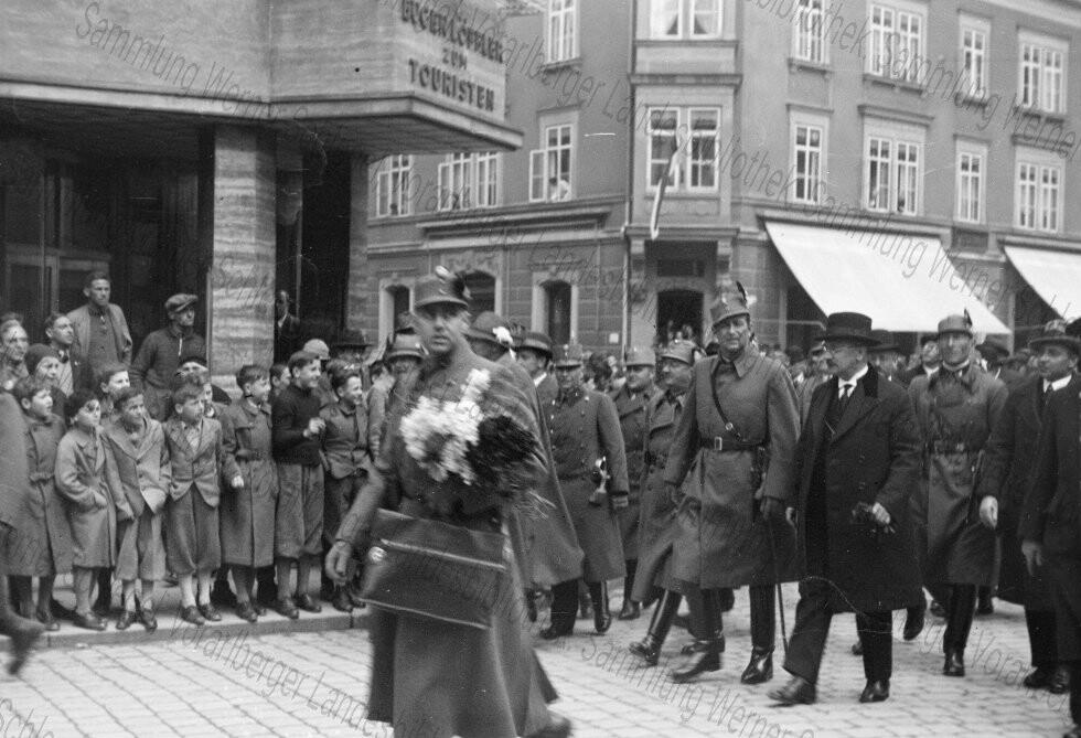 Diese Serie zeigt den Besuch des Vizekanzlers und Heimwehrführers Ernst Rüdiger Starhemberg (1899-1956) am 30. und 31. März 1935 in Bregenz. Starhemberg war als Vertreter der faschistischen Heimwehren Teil der österreichischen Bundesregierung. Zwischen dem Staatsstreich vom 4. März 1933 und dem kurzen Bürgerkrieg im Februar 1934 hatten Bundeskanzler Engelbert Dollfuß (1892-1934) und seine Gefolgsleute im Verbund mit den Heimwehren die demokratischen Strukturen in Österreich untergraben und eine faschistische Diktatur errichtet. Diese Diktatur trägt in der Literatur viele Namen: Austrofaschismus, "christlicher Ständestaat" oder nach den beiden Führerfiguren auch Dollfuß-Schuschnigg-Diktatur. Dem Austrofaschismus gelang es trotz seiner umfassenden Machtmittel nicht, die wirtschaftlichen Probleme, die grassierende Arbeits- und Perspektivlosigkeit in den Griff zu bekommen. Die Diktatur lehnte sich sehr stark an das faschistische Italien an und bereitete letztlich ihr eigenes Ende vor, indem sie zwar gegen Kommunisten und Sozialdemokraten hart vorging, gegen den weitaus aggressiver agierenden Nationalsozialismus jedoch gleichzeitig jeden Nachdruck vermissen ließ. Folgerichtig fand die austrofaschistische Diktatur im März 1938 mit dem "Anschluss" Österreichs an Hitler-Deutschland sein Ende.