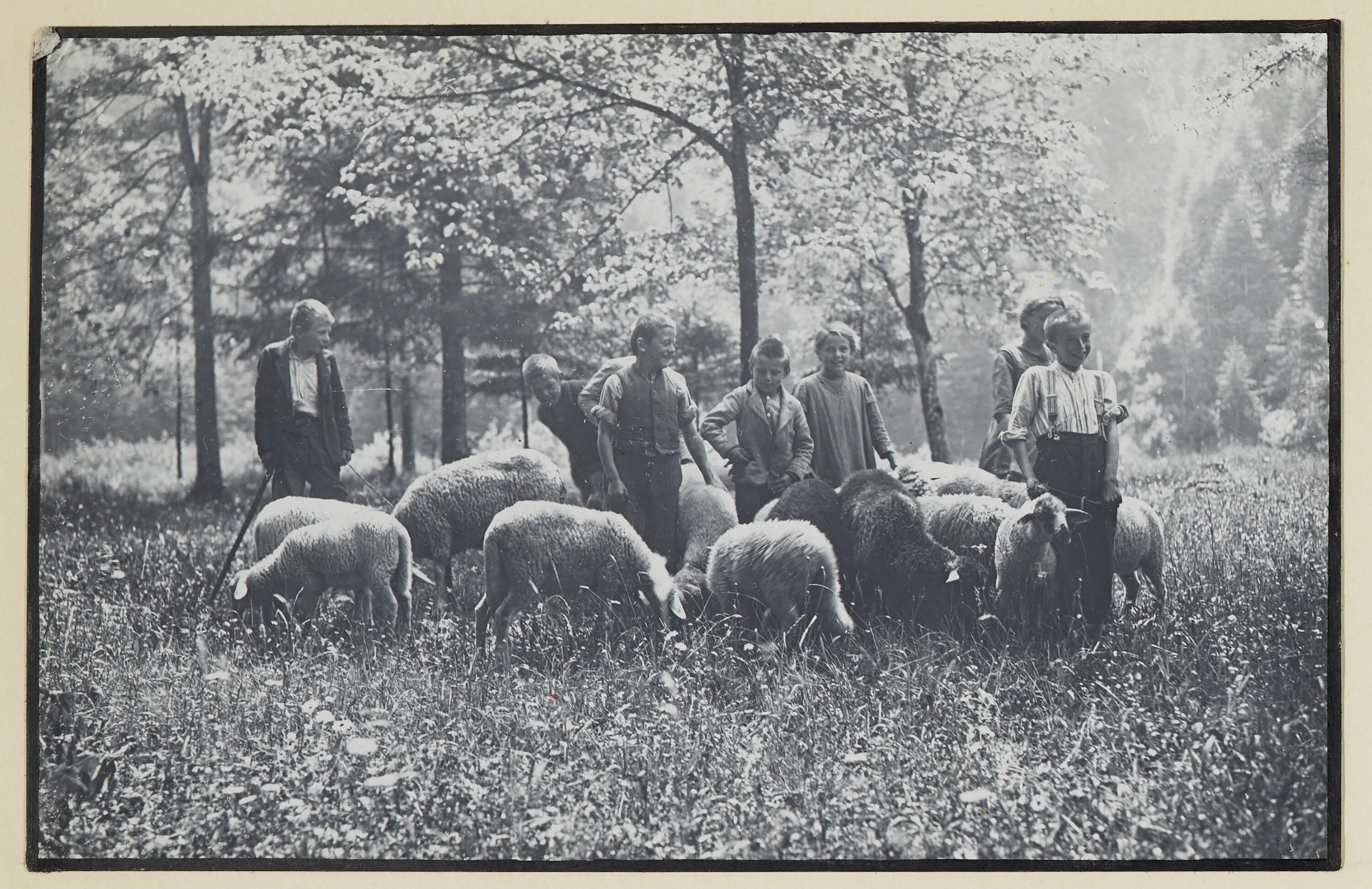 Gruppe Schafe hütender Kinder in Lochau
