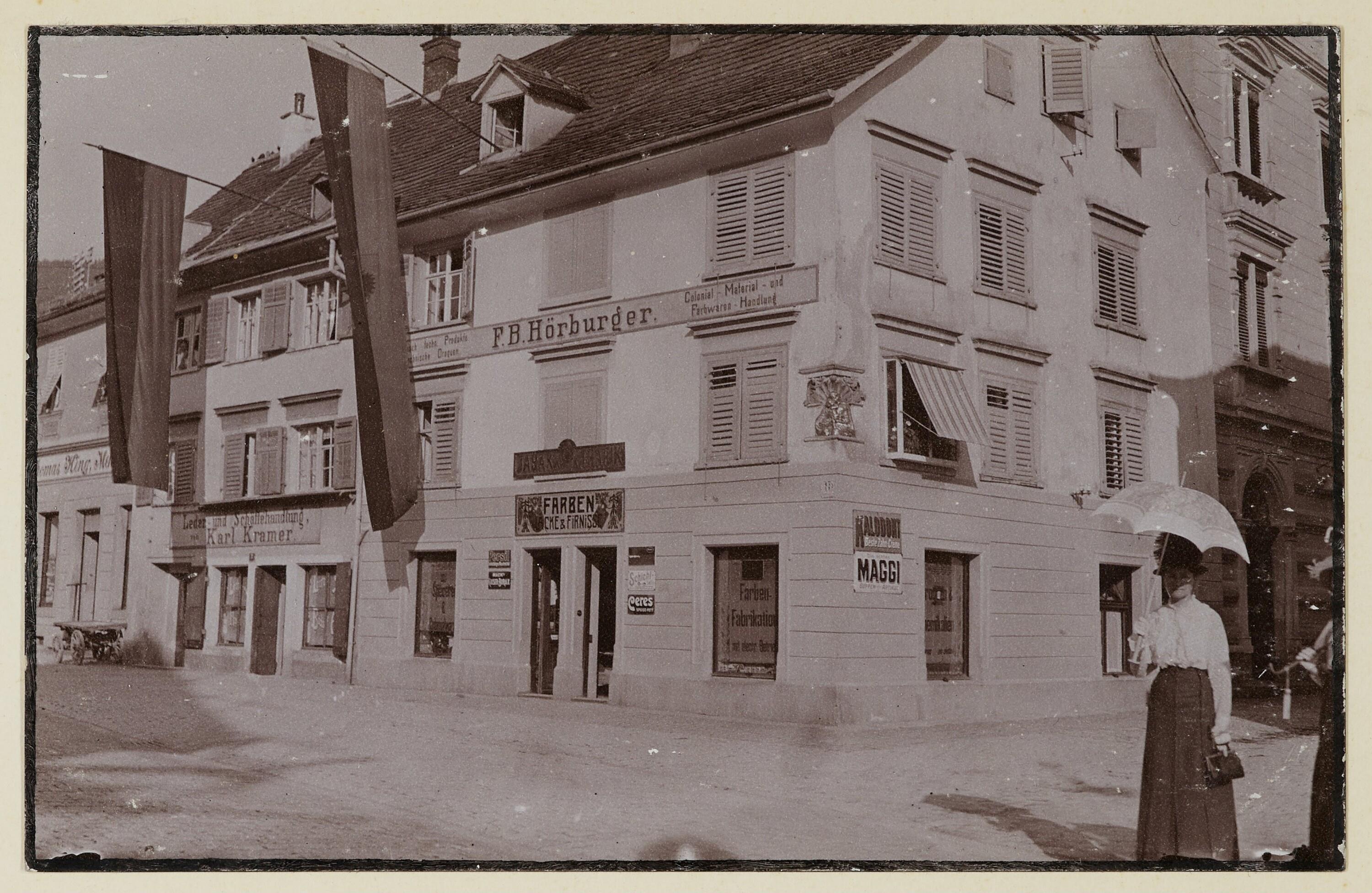 • Maria Zigna vor dem beflaggten Kolonialwarengeschäft von F. B. Hörburger in der Kornmarktstraße.