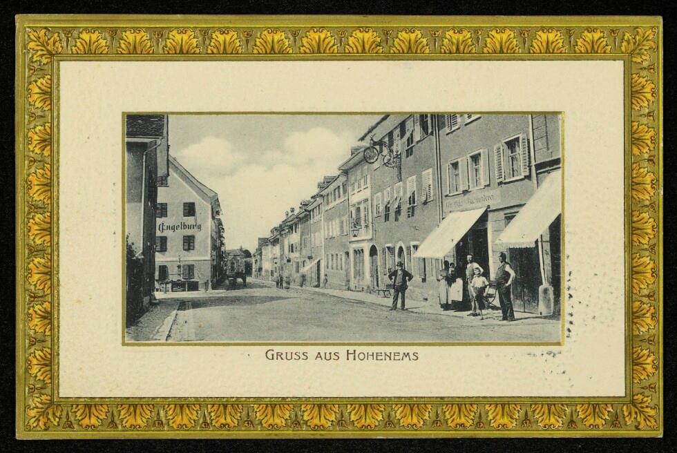 • 2. Haus von rechts: Gasthaus Krone, Marktstraße 12. Bereits ab 1640 als Gastbetrieb nachgewiesen. Von 1922 bis 1926 war die Dornbirner Sparkasse in einem Nebenzimmer eingemietet. Nach der Schließung des Gastbetriebes 1956, kurzeitige Nutzung durch das Elektrogeschäft Jäger & Co., ab 1960 Georg Märk, Raumausstattung und Buchhandlung und seit 2009 Optiker Greber. (Hohenems-Lexikon, Hohenems 2021, Seite 121/122)