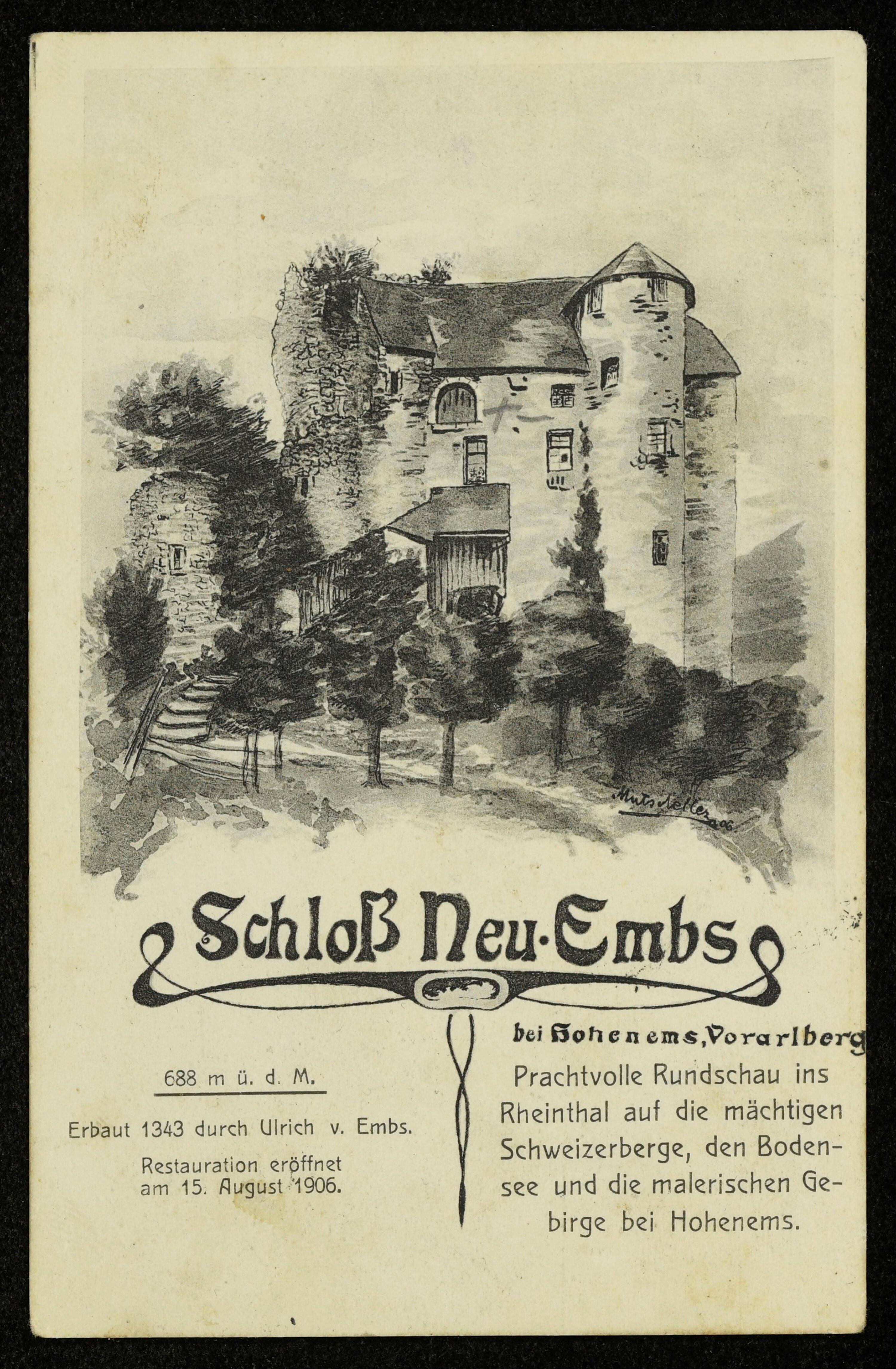 • Neu-Ems, auch Glopper oder Tannenburg genannt. 1343 wurde der Bau einer zweiten Burg erlaubt, wann jedoch begonnen wurde, ist nicht bekannt. 1407 wurde die Burg im Appenzeller Krieg erobert und gebrochen. Hans Ulrich I. veranlasste nach 1421 den Wiederaufbau als dreigeschossiges, achteckiges, bergfriedartiges Bollwerk. 2. Hälfte 15. Jh. Bau des mächtigen Palas und Errichtung der Kapelle 1603. Ab 1670 verfällt die Burg langsam. 1759 fällt sie an Österreich und wird nach umfangreichen Restaurierungen diente sie 1760 als Lazarett. War auch noch dauern bewohnt. Nach wechselhaften Besitzverhältnissen seit 1954 wieder im Besitz der Familie Waldburg-Zeil. 2018 zu einem anspruchsvollen Urlaubsdomizil umgebaut. (Hohenems-Lexikon, Hohenems 2021, Seite 235/236)