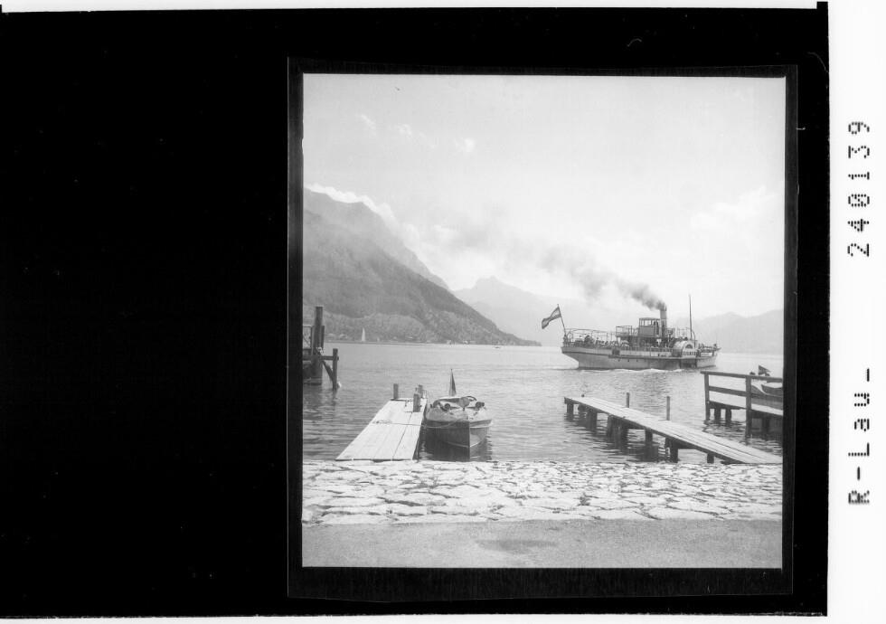 [Schaufelraddampfer im Traunsee bei Gmunden mit Schlafender Griechen / Salzkammergut]