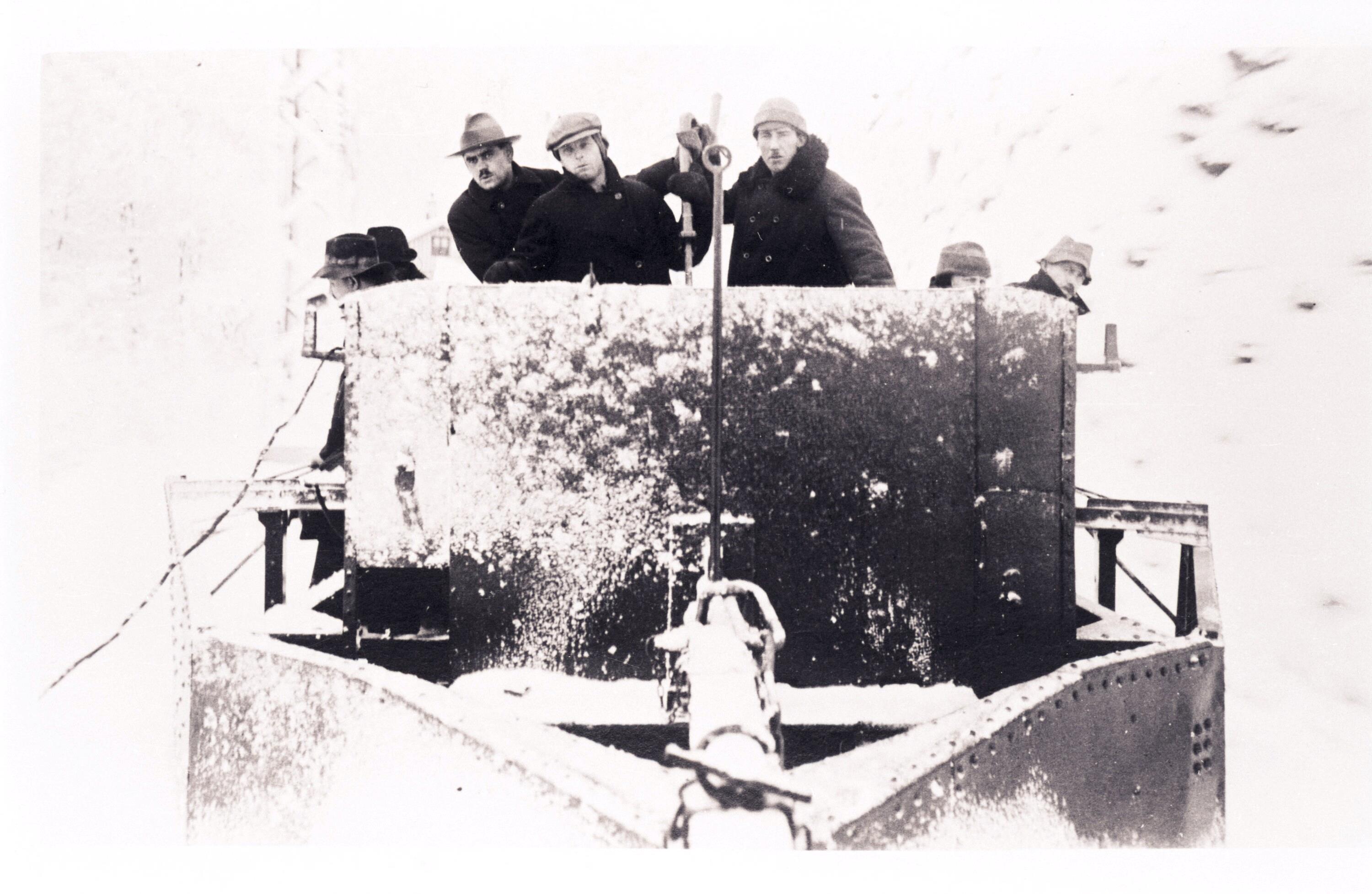 • Das Bild zeigt Bahnarbeiter bei einer Schneepflugfahrt auf der Arlbergstrecke.