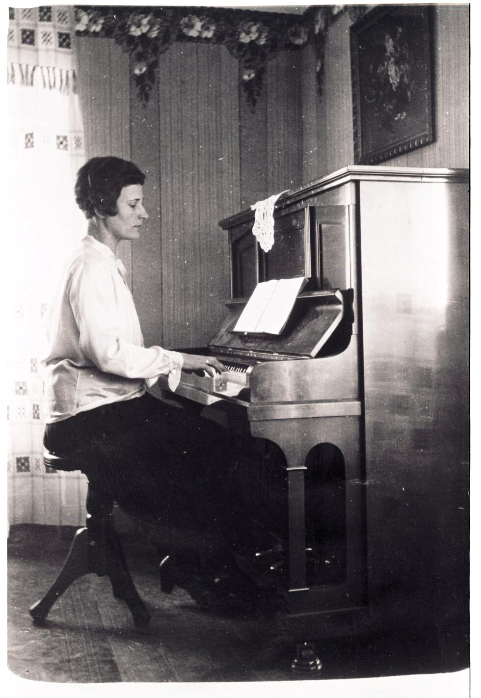 • Das Bild zeigt Mathilde Preiß am Piano. Mathilde Preiß war die Ehefrau des sozialdemokratischen Landtagsabgeordneten Fritz Preiß.