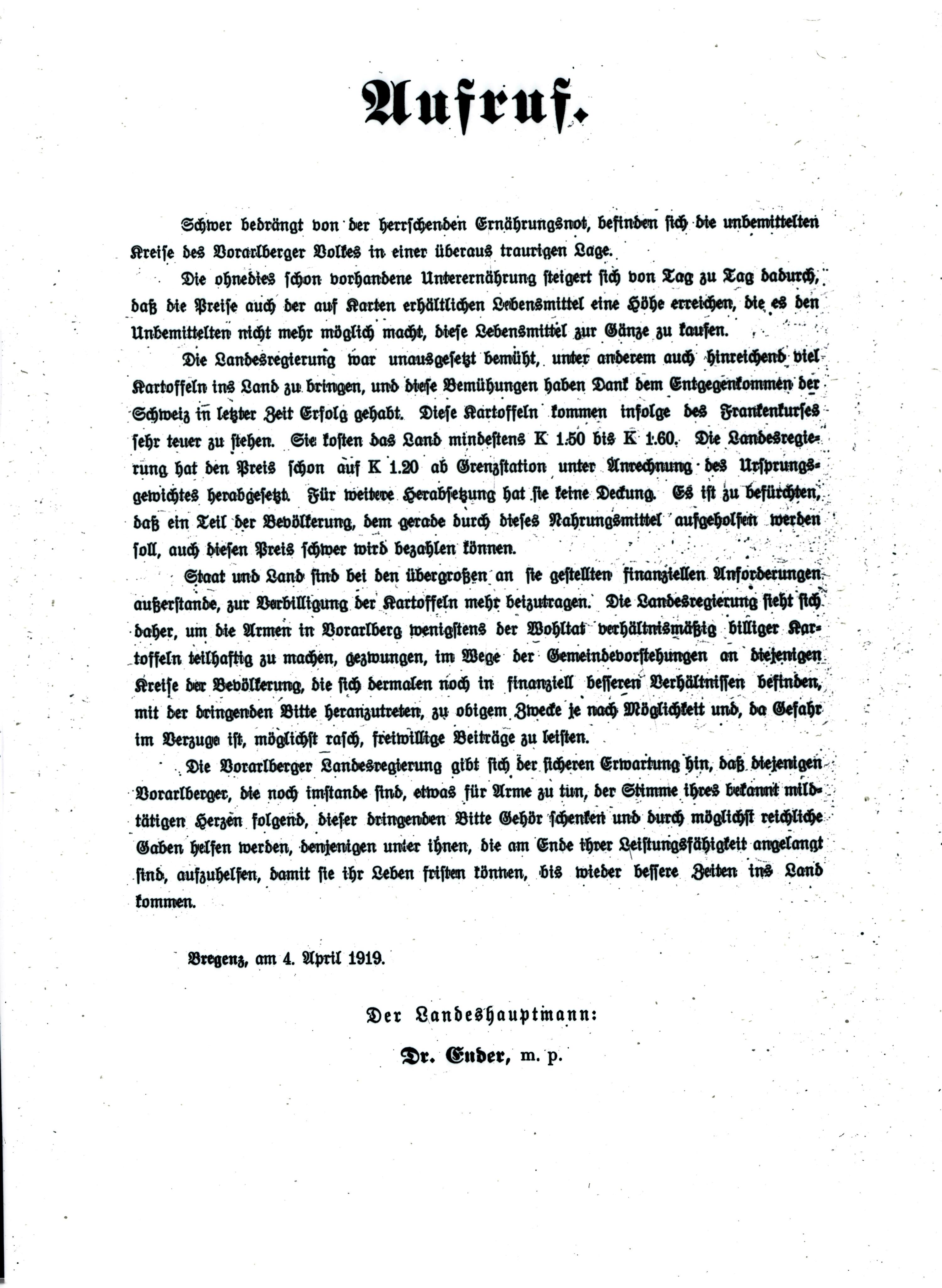 • Das Bild zeigt einen Spendenaufruf Otto Enders aus dem Jahr 1919. In Vorarlberg herrschte akute Ernährungsnot.