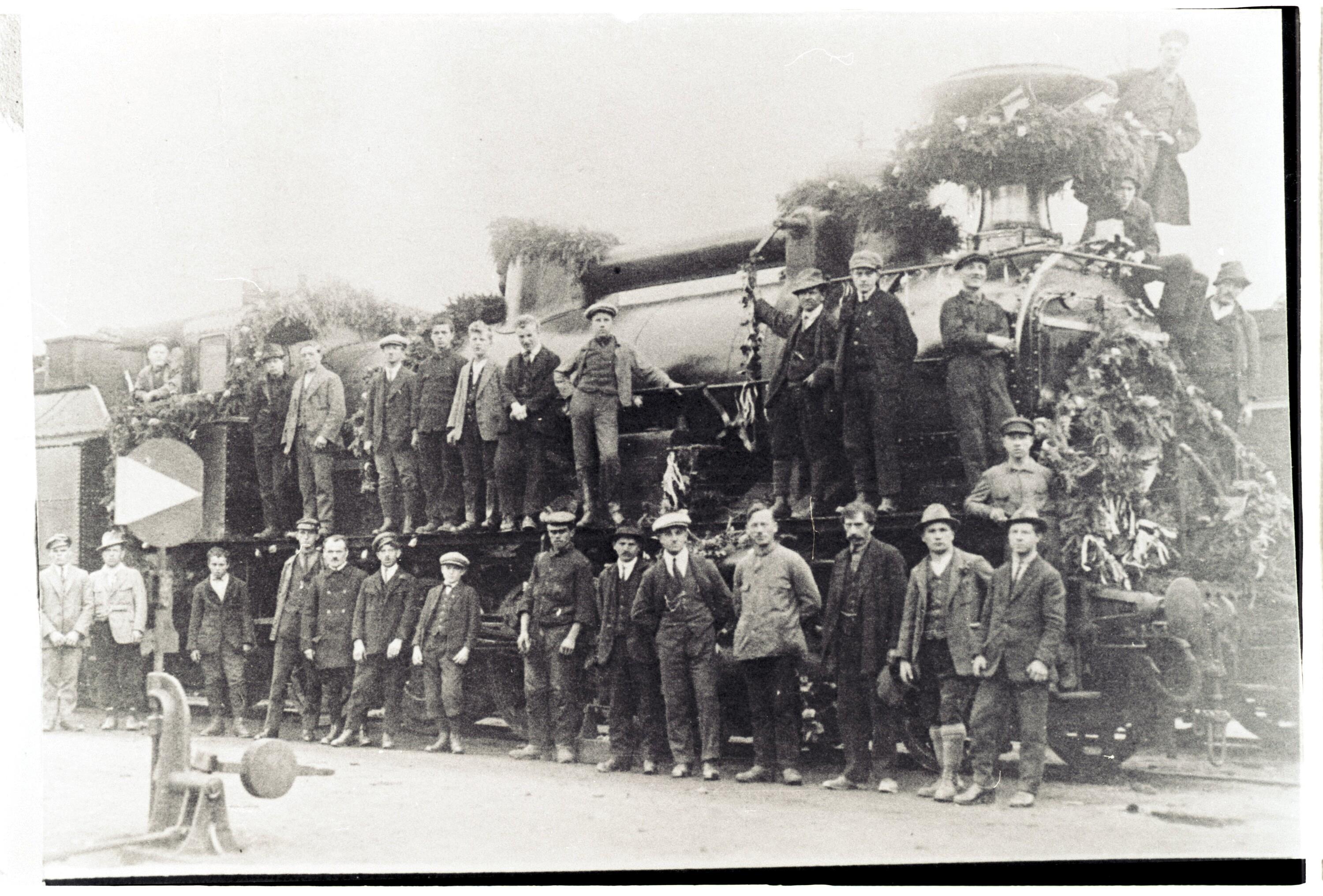 • Das Bild zeigt sozialdemokratische Eisenbahner auf einer bekränzten Lokomotive am 1. Mai 1925 in der Remise Bludenz