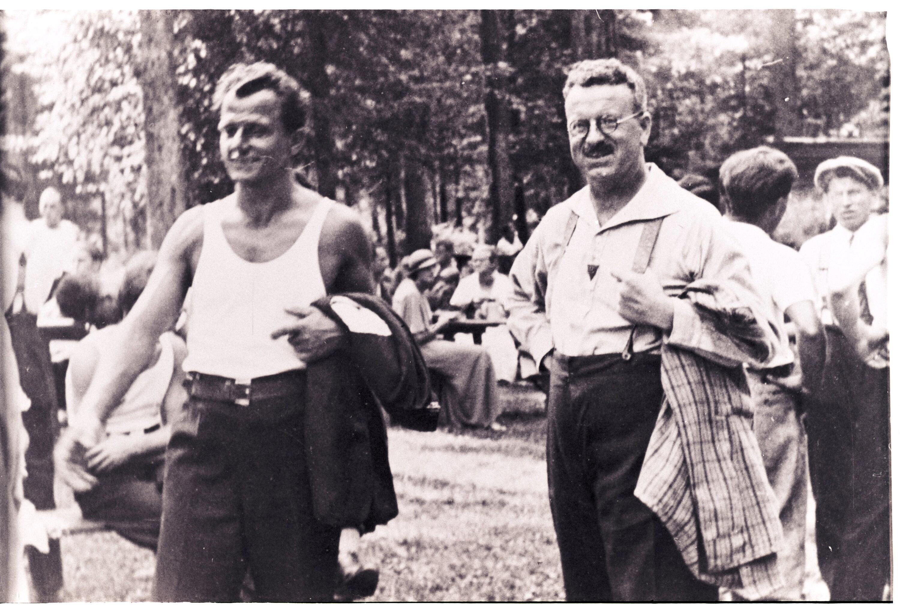 • Diese Bild zeigt den späteren Landtagsabgeordneten, Landesrat und SPÖ-Landesvorsitzenden Jakob Bertsch (links) und den Landtagsabgeordneten und Arbeiterkammer-Präsidenten Wilhelm Sieß am 20. August 1933 beim Bezirksturnfest des ATSV in der Enz in Dornbirn. Es war das letzte Bezirksturnfest des ATSV vor dem Februar 1934 und dem Verbot der SDAP.