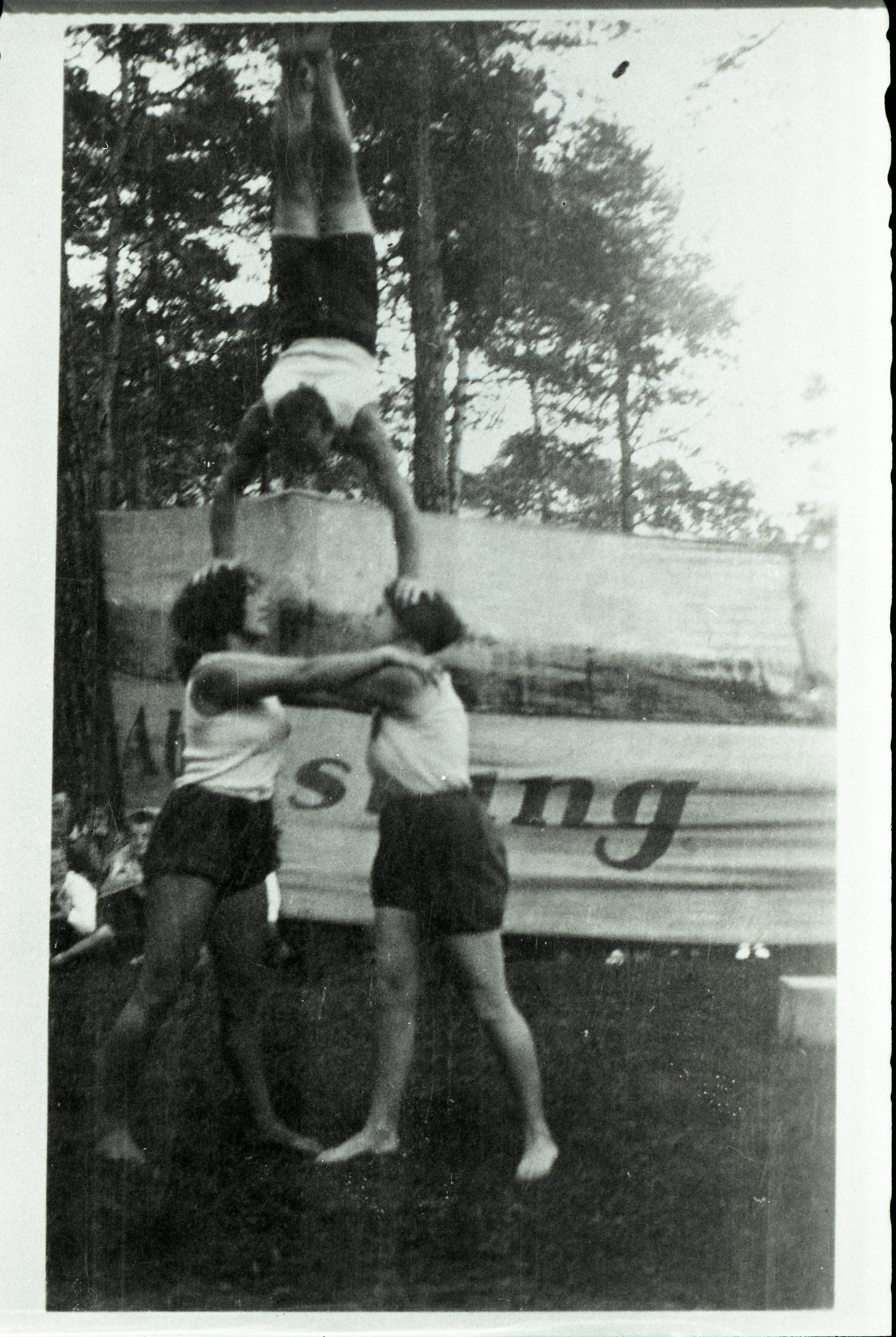 • Das Bild zeigt Mitglieder des ATSV Bludenz bei Turnübungen während des Waldfestes in Bludenz-Oberdaneu. links: Rosa Collini, rechts: Elsa Zunk, oben: Alois Pichlkostner (alle Feldkirch)