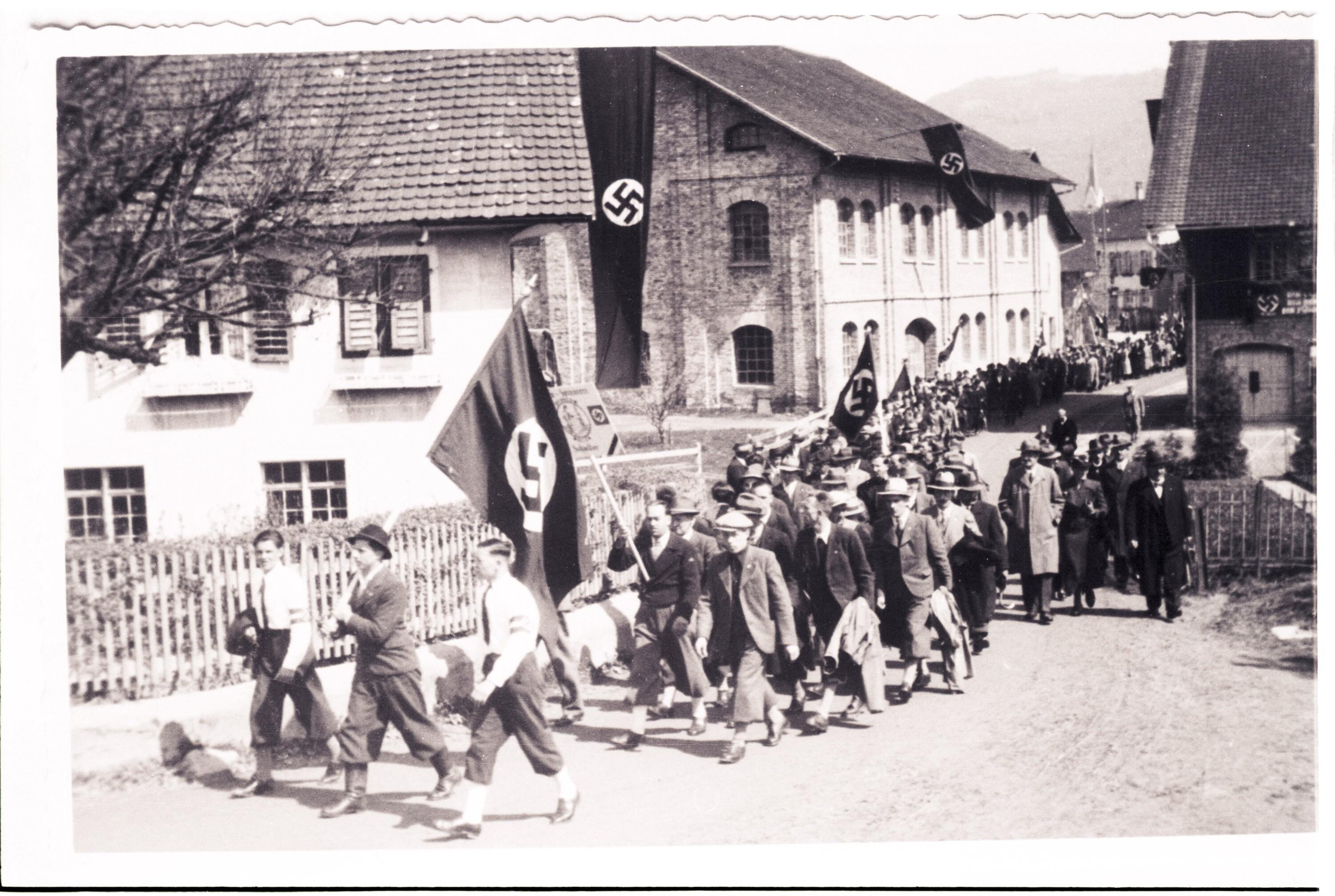 • Das Bild zeigt Arbeiter der Firma Schoeller in Bregenz bei ihrem ersten gemeinsamen Ausmarsch nach dem "Anschluss" im März 1938.
