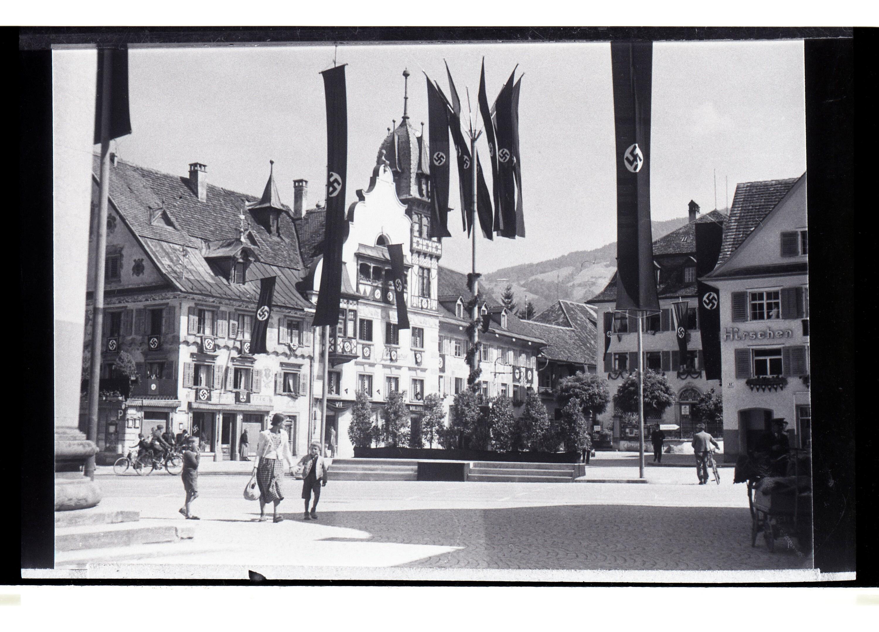 • Das Bild zeigt den beflaggten Dornbirner Marktplatz (damals Adolf-Hitler-Platz).