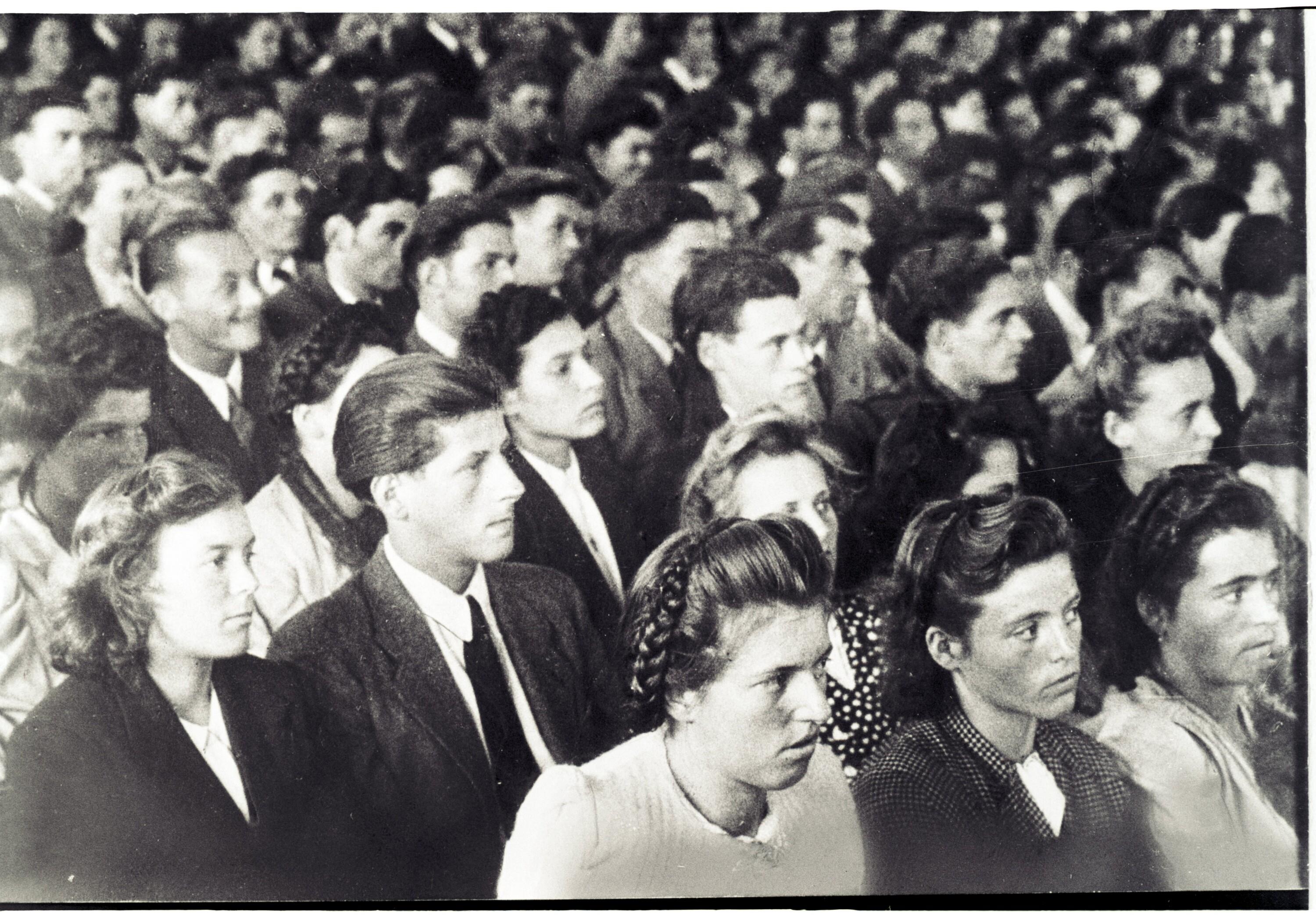 • Das Bild zeigt das Publikum der Jungbürgerfeier der Vorarlberger Arbeiterkammer im September 1947 in der Sporthalle Bregenz.