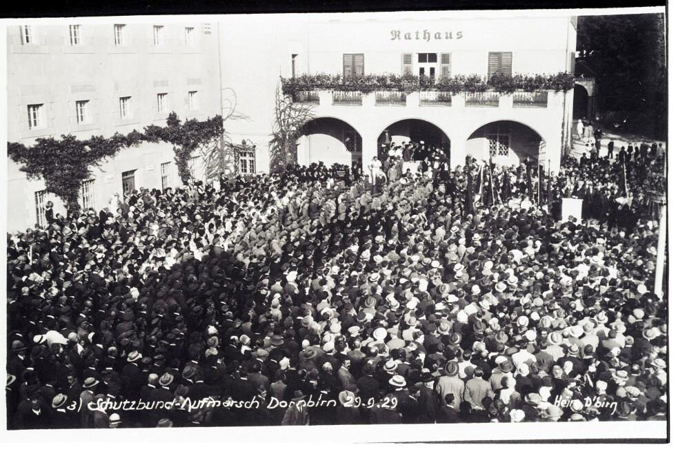 • Das Bild zeigt den Schutzbund-Aufmarsch oder vielmehr die SDAP-Kundgebung in Dornbirn am 29. September 1929. Beim Republikanischen Schutzbund handelte es sich um eine paramilitärische Organisation der Sozialdemokratischen Arbeiterpartei (kurz SDAP), deren Aufgabe vor allem im Schutz sozialdemokratischer Kundgebungen vor Übergriffen und Störungen der politischen Gegner bestand. Während des Österreichischen Bürgerkriegs 1934 sollte der Schutzbund einer Übermacht bestehend aus den faschistischen Heimwehren, dem Bundesheer, der Polizei und Gendarmerie gegenüberstehen. Bildmitte links (helle Uniformen): Schutzbund; Bildmitte rechts (dunkle Uniformen): ETO (Eisenbahn- und Telegraphen-Ordner)