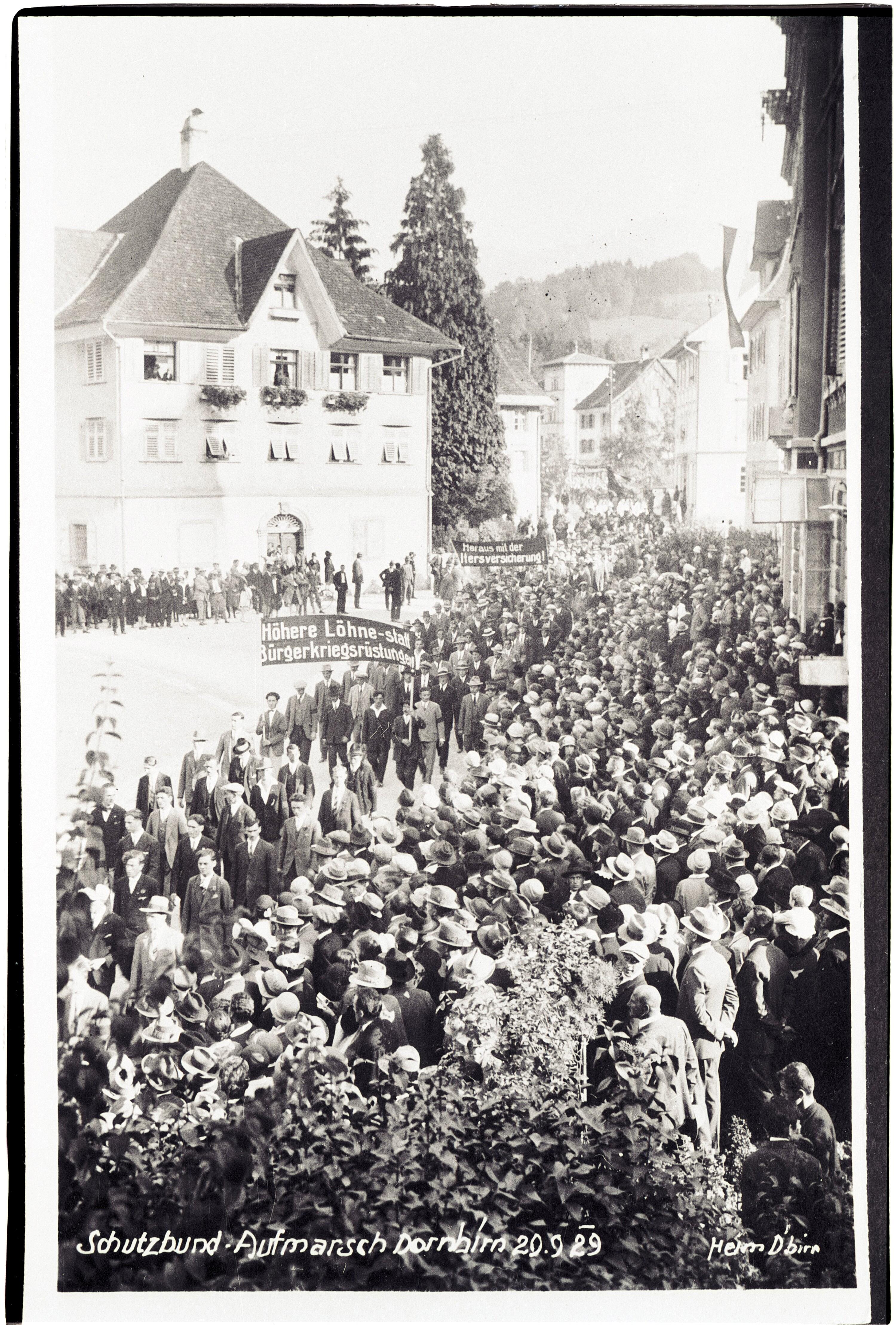 • Das Bild zeigt Eindrücke des Schutzbund-Aufmarschs oder vielmehr der SDAP-Kundgebung in Dornbirn am 29. September 1929. Beim Republikanischen Schutzbund handelte es sich um eine paramilitärische Organisation der Sozialdemokratischen Arbeiterpartei (kurz SDAP), deren Aufgabe vor allem im Schutz sozialdemokratischer Kundgebungen vor Übergriffen und Störungen der politischen Gegner bestand. Während des Österreichischen Bürgerkriegs 1934 sollte der Schutzbund einer Übermacht bestehend aus den faschistischen Heimwehren, dem Bundesheer, der Polizei und Gendarmerie gegenüberstehen. Bildmitte links (helle Uniformen): Schutzbund; Bildmitte rechts (dunkle Uniformen): ETO (Eisenbahn- und Telegraphen-Ordner)