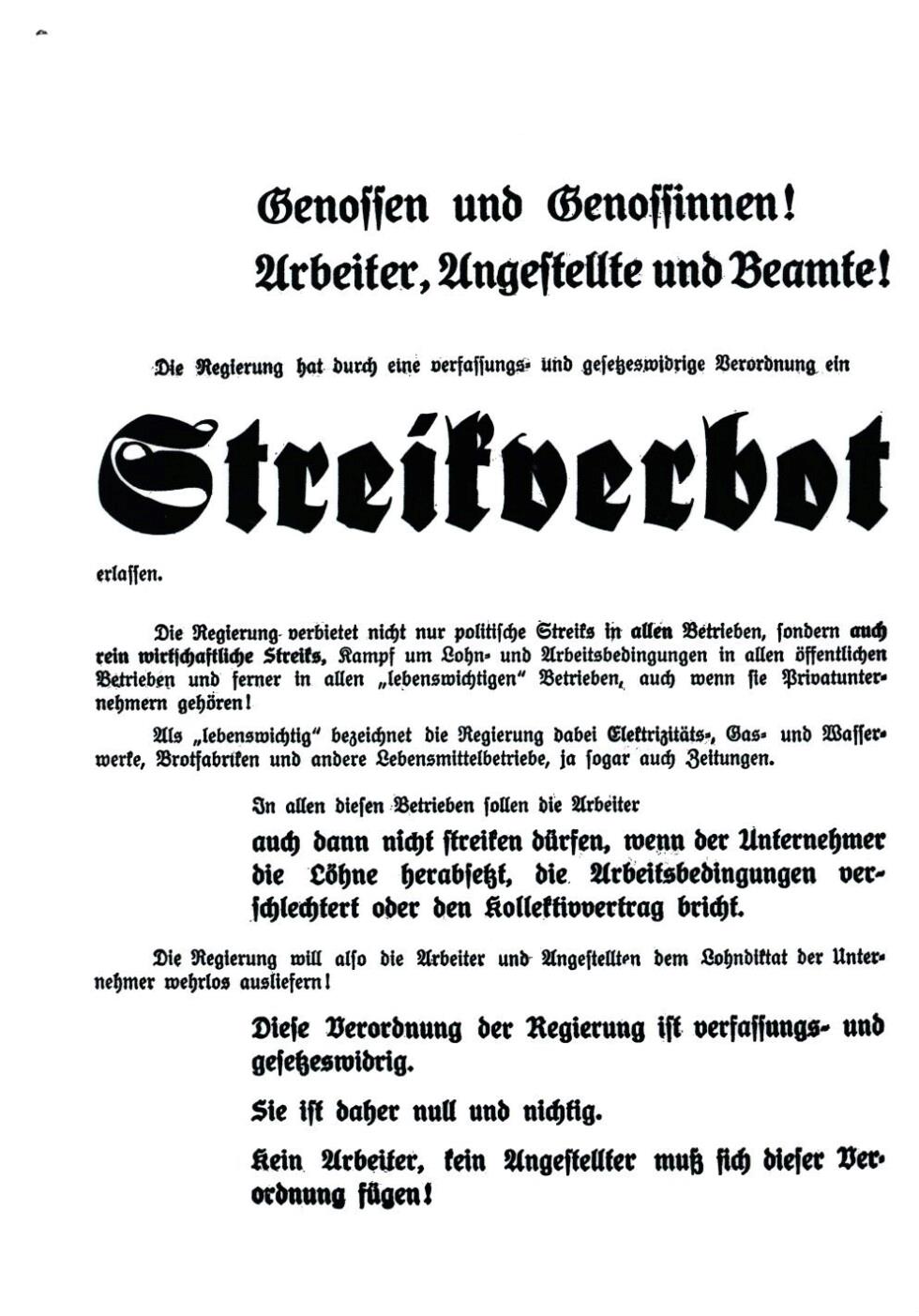 • Das Bild zeigt ein Flugblatt der SDAP betreffend das durch die Regierung Dollfuß verhängten verfassungswidrigen Streikverbots im Jahr 1933.