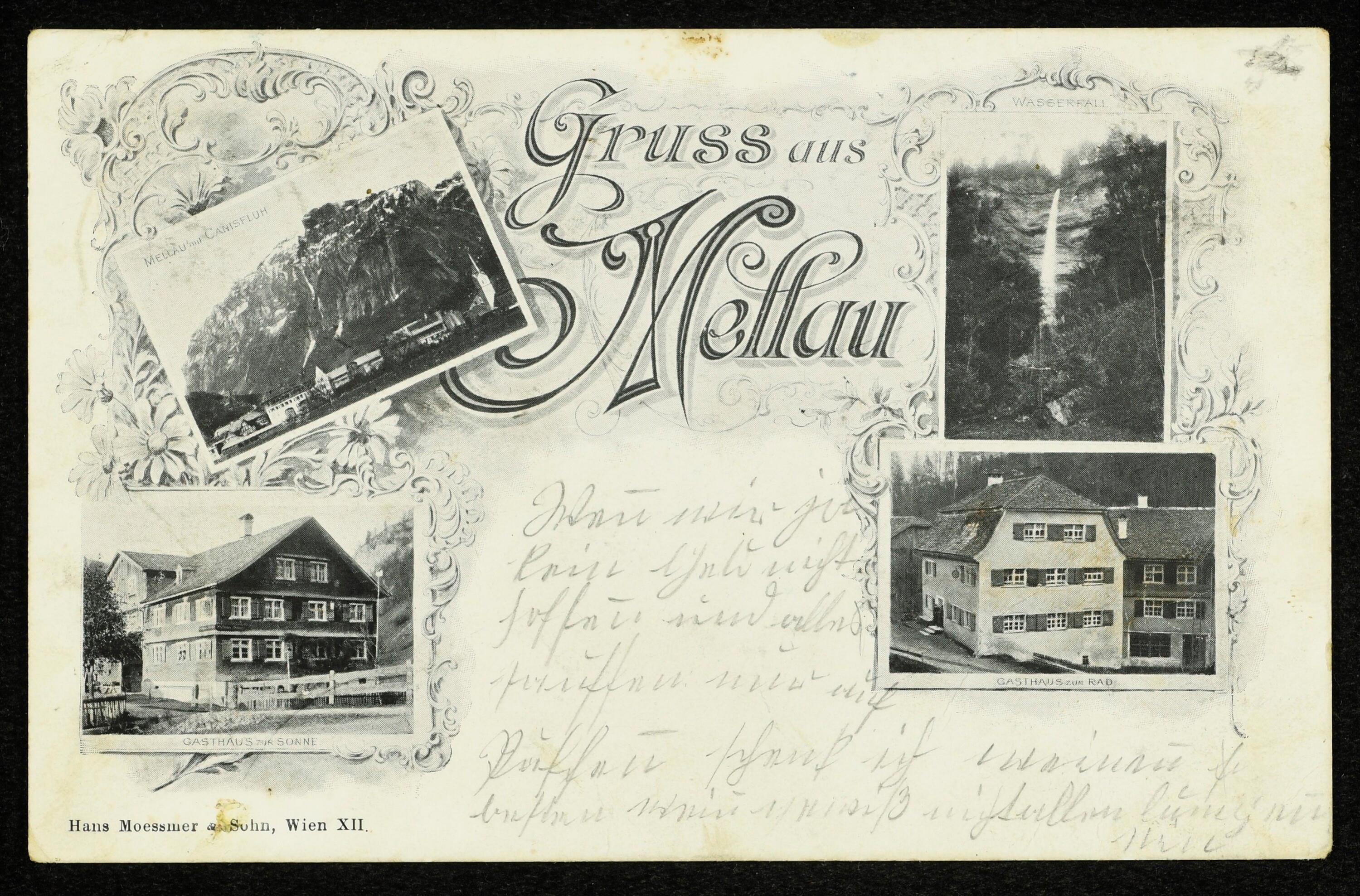 • Das rechts unten abgebildete um 1500 gegründete Gasthaus "zum Rad", auch "Klaus-Mühle" war Ende des 19. Jahrhundert das wohl das älteste noch existierende Gasthaus Mellaus. Vgl. Markus Nachbaur / Anton Hänsler / Jakob Simma / Artur Wüstner, Wirtschaft und Fremdenverkehr, in: Montfort. Zeitschrift für Geschichte, Heimat- und Volkskunde Vorarlbergs, Jg. 1965, Heft 3, S. 352
