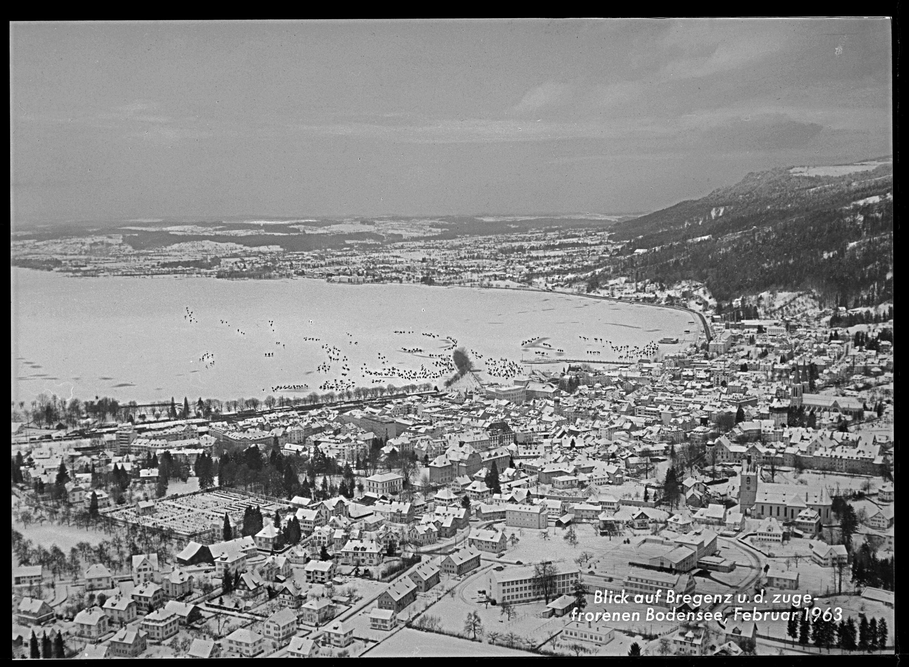 Blick auf Bregenz und den zugefrorenen Bodensee Februar 1963