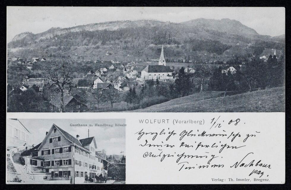 • Das links unten zu sehende Gasthaus "Rössle" diente viele Jahre als Versammlungshaus, Bäckerei und Gemischtwarenhandlung. Das Gebäude wurde 1982 abgerissen. Vgl. Gemeinde Wolfurt (Hrsg.),Wolfurt in alten Bildern, Wolfurt 1983, S. 17.