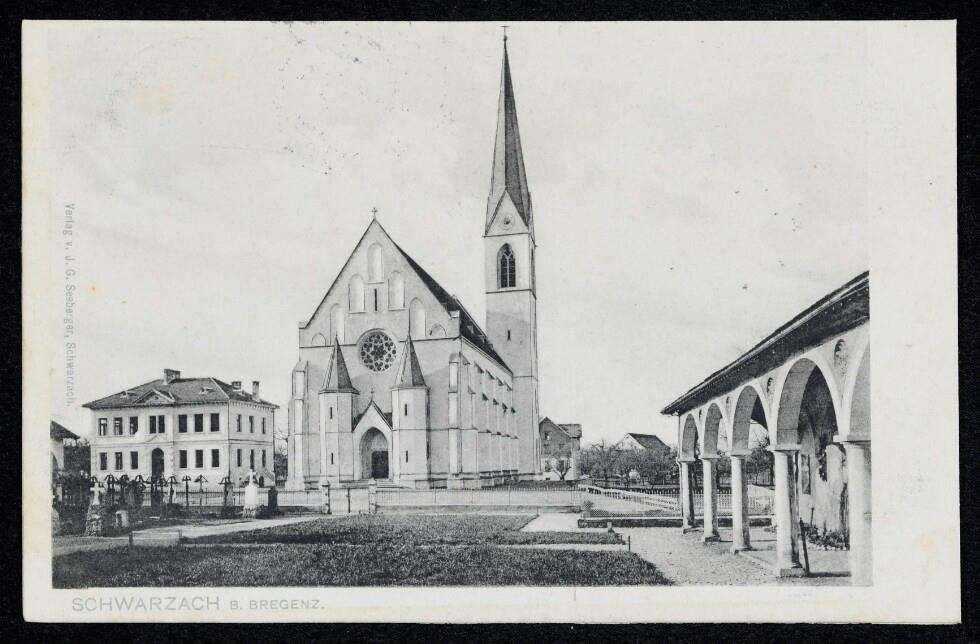 • Links neben der Kirche ist das 1905 errichtete Schulgebäude zu sehen. Der Neubau war aufgrund des Bevölkerungswachstums notwendig geworden. In der Volksschule wurden rund 140 Jungen unterrichtet, während die Mädchen in einer eigenen Mädchenschule unterwiesen wurden. Vgl. Severin Holzknecht, Johann Kohler, Schwarzach und die Moderne, in: Ingrid Böhler (Hrsg.), "Kohlschwarz ist seine Gesinnung". Johann Kohler (1839-1916) und seine Zeit, Tübingen 2025, S. 206-208.