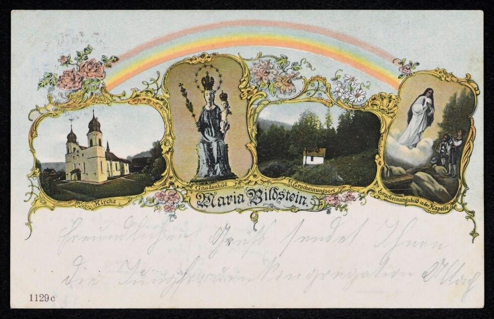• Die rechts zu sehende Erscheinungskapelle in Bildstein wurde 1887 erbaut. Vgl. Karl Ilg, 1792-1992. 200 Jahre Pfarrgemeinde Maria-Bildstein, Wolfurt 1992, S. 33.