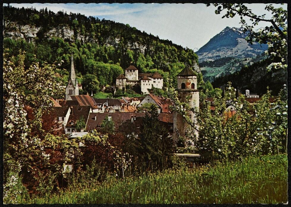 [Feldkirch] : [Feldkirch, Vorarlberg mit Schattenburg und Katzenturm gegen Gurtisspitze, 1781 m, und Galinakopf, 2202 m ...]