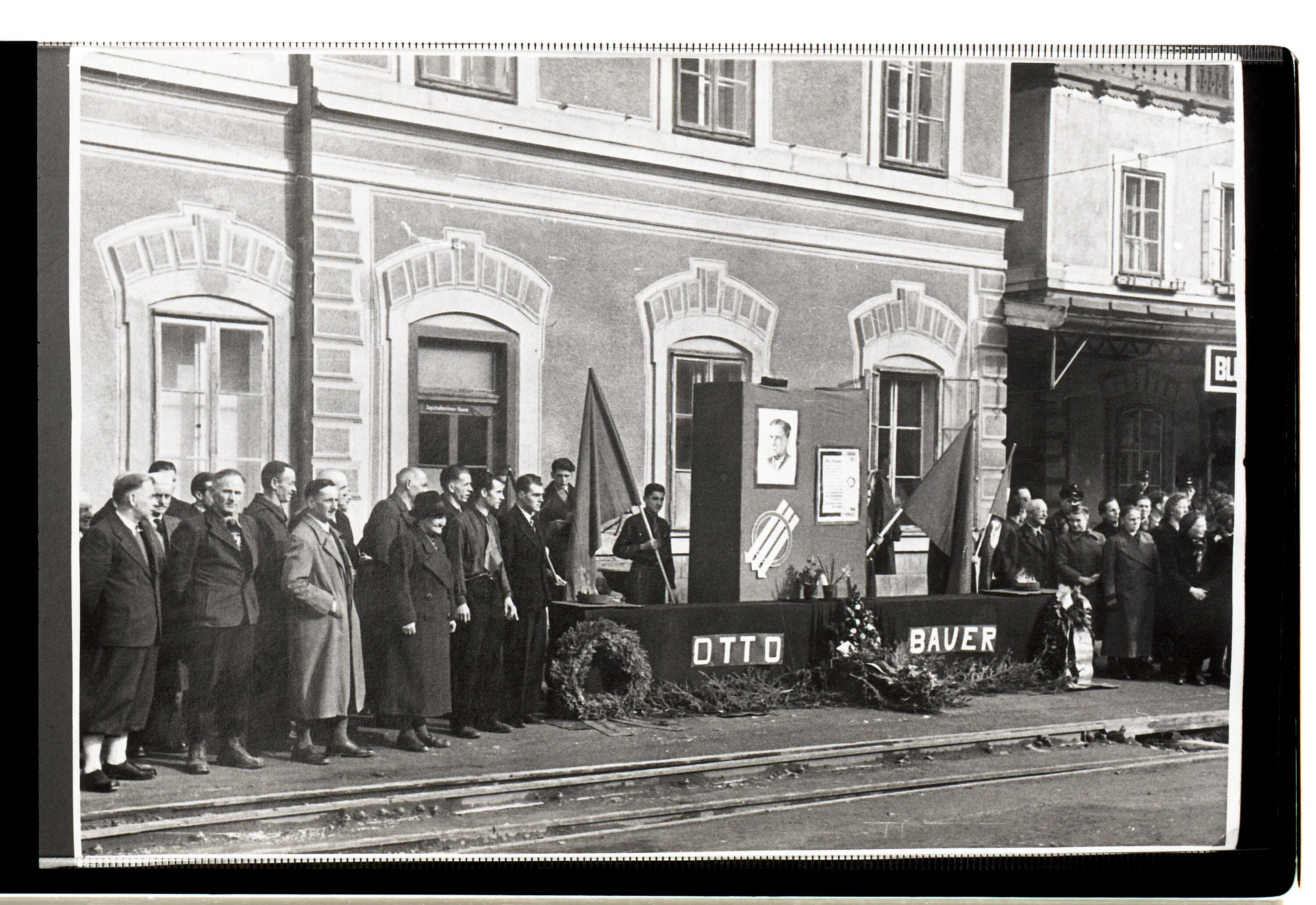 • Das Bild zeigt das Empfangskomitee am Bludenzer Bahnhof anlässlich der Überführung der sterblichen Überreste Otto Bauers von Paris nach Wien. Otto Bauer war einer der führenden sozialdemokratischen Politiker und Theoretiker der Zwischenkriegszeit und war gezwungen, Österreich im Februar 1934 zu verlassen.