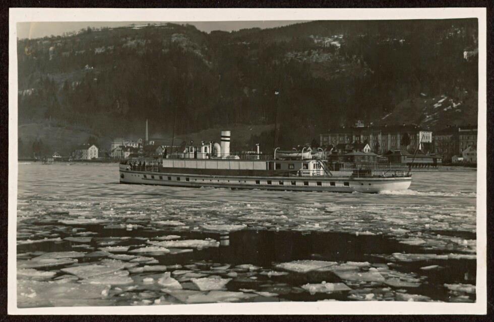 [Die MS Österreich durchbricht das Eis im See]