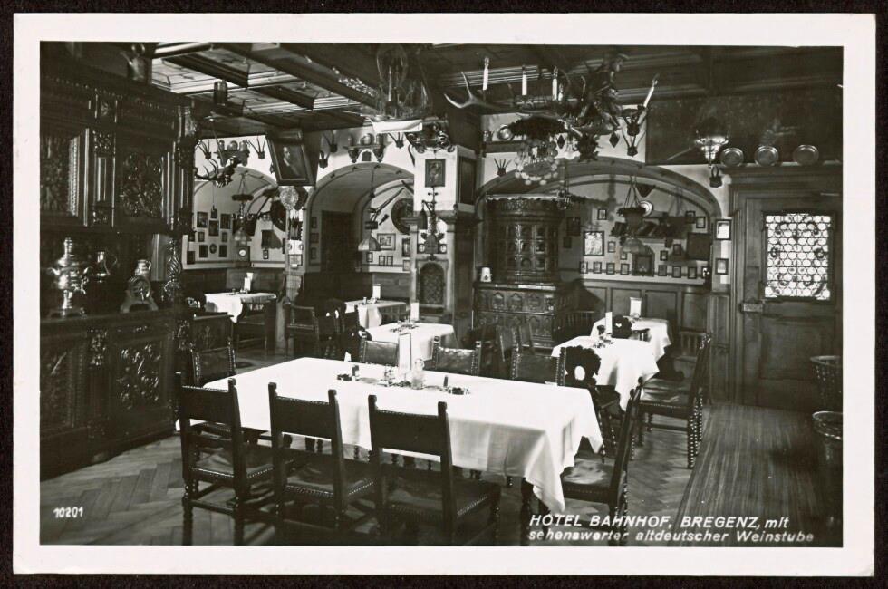 [Bregenz] : [Hotel "Bahnhof" Bregenz "Sehenswerte" Altdeutsche Weinstube mit Original-Einrichtung aus dem 16. Jahrh. ...]