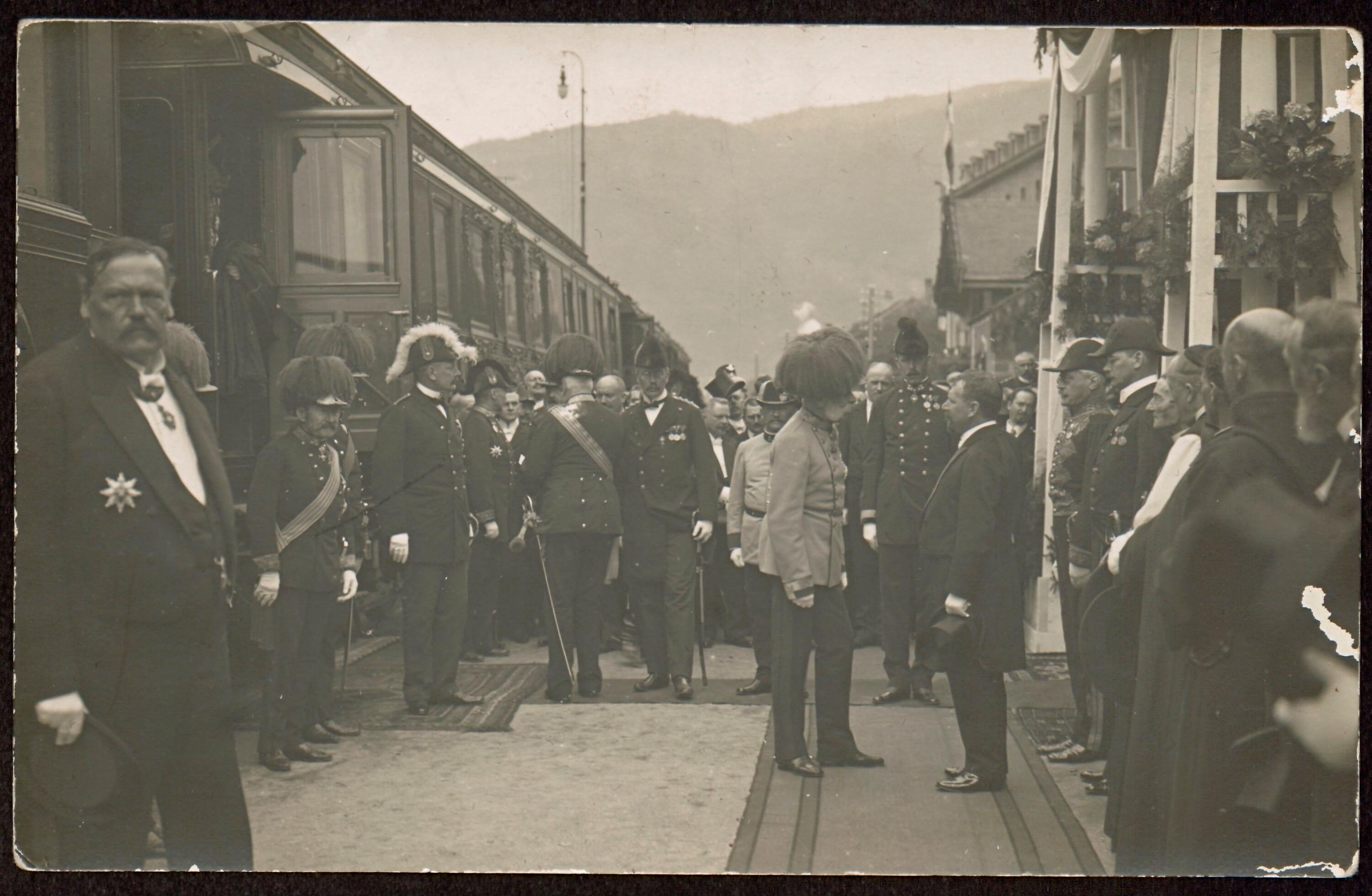 [Bregenzer Bürgermeister Kinz begrüßt Kaiser Franz Josef I. 1909 in Bregenz]
